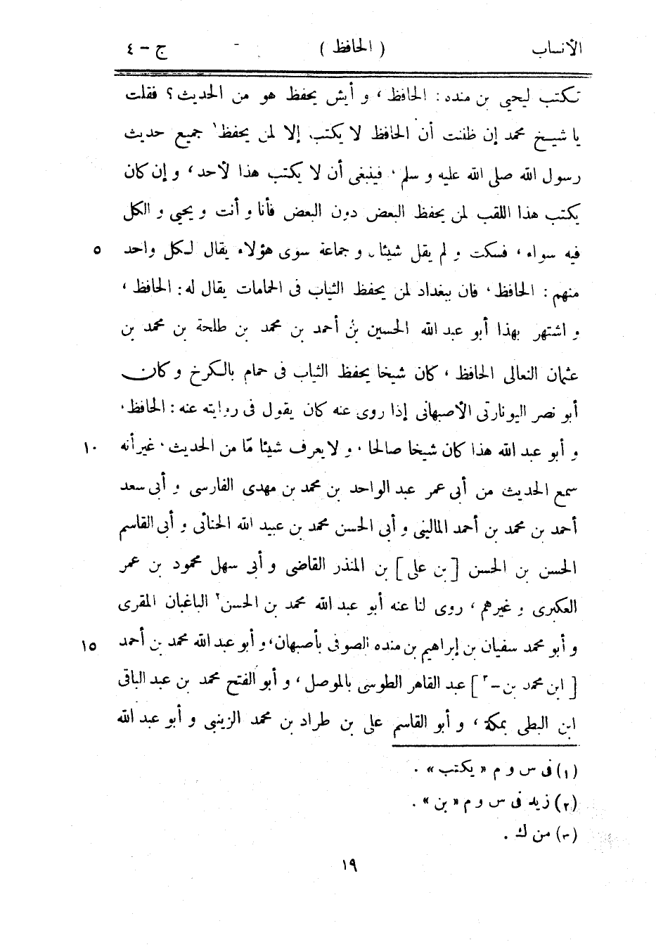 تكتب ليحيى بن مندة: الحافظ، وأيش يحفظ هو من الحديث؟ فقلت يا شيخ محمد إن ظننت أن الحافظ لا يكتب إلا لمن يحفظ [1] جميع حديث رسول الله صلى الله عليه وسلم، فينبغي أن لا يكتب هذا لأحد، وإن كان يكتب هذا اللقب لمن يحفظ البعض دون البعض فأنا وأنت ويحيى والكل فيه سواء، فسكت ولم يقل شيئا وجماعة سوى هؤلاء يقال لكل واحد منهم: الحافظ، فان ببغداد لمن يحفظ الثياب في الحمامات يقال له: الحافظ، واشتهر بهذا أبو عبد الله الحسين بن أحمد بن محمد بن طلحة بن محمد بن عثمان النعالى الحافظ، كان شيخا يحفظ الثياب في حمام بالكرخ وكان أبو نصر اليونارتى الأصبهاني إذا روى عنه كان يقول في روايته عنه: الحافظ، وأبو عبد الله هذا كان شيخا صالحا، ولا يعرف شيئا ما من الحديث، غير أنه سمع الحديث من أبى عمر عبد الواحد بن محمد بن مهدي الفارسي وأبى سعد أحمد بن محمد بن أحمد الماليني وأبى الحسن محمد بن عبيد الله الحنائى وأبى القاسم الحسن بن الحسن [بن على] بن المنذر القاضي وأبى سهل محمود بن عمر العكبريّ وغيرهم، روى لنا عنه أبو عبد الله محمد بن الحسن [2] الباغبان المقري وأبو محمد سفيان بن إبراهيم بن مندة الصوفي بأصبهان، وأبو عبد الله محمد بن أحمد [ابن محمد بن-[3]] عبد القاهر الطوسي بالموصل، وأبو الفتح محمد بن عبد الباقي ابن البطي بمكة، وأبو القاسم على بن طراد بن محمد الزينبي وأبو عبد الله