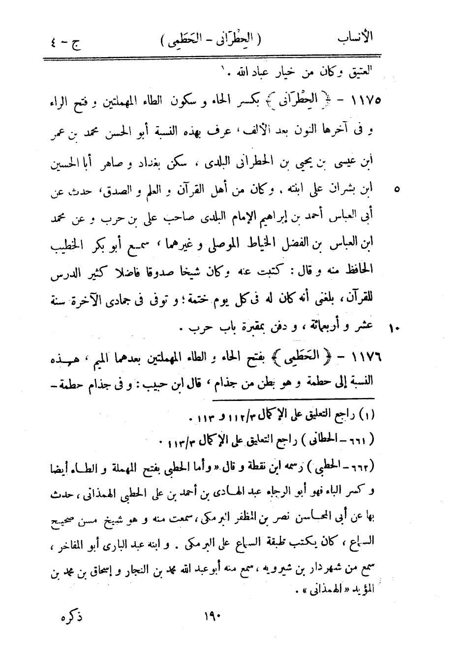 (662- الحطبى) رسمه ابن نقطة وقال «وأما الحطبى بفتح المهملة والطاء أيضا وكسر الباء فهو أبو الرجاء عبد الهادي بن أحمد بن على الحطبى الهمذانيّ، حدث بها عن أبى المحاسن نصر بن المظفر البرمكي، سمعت منه وهو شيخ مسن صحيح السماع، كان يكتب طبقة السماع على البرمكي. وابنه عبد الباري أبو المفاخر، سمع من شهردار بن شيرويه، سمع منه أبو عبد الله محمد بن النجار وإسحاق بن محمد بن المؤيد «الهمذانيّ» .