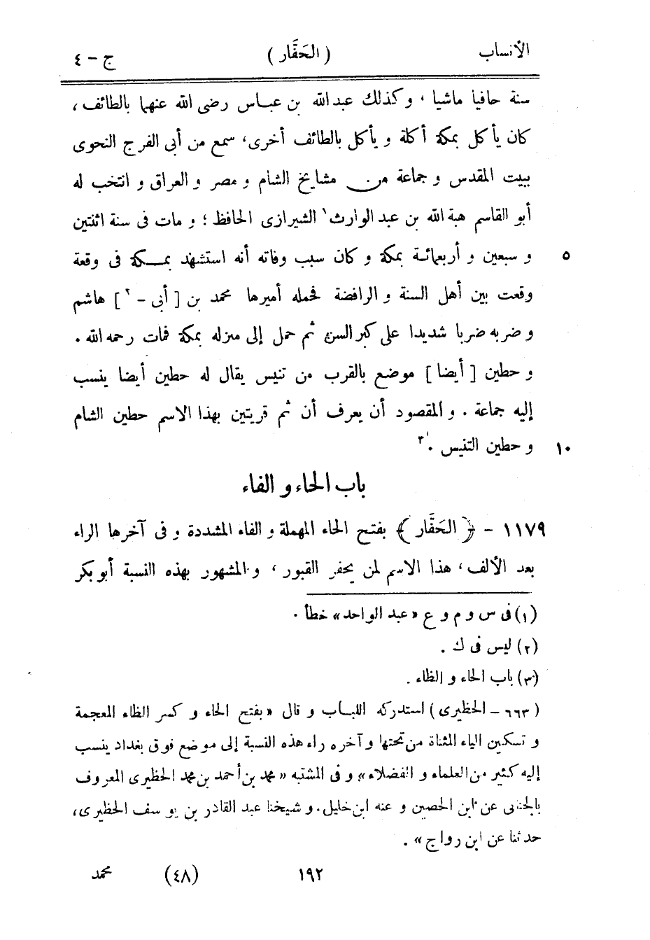 (663- الحظيرى) استدركه اللباب وقال «بفتح الحاء وكسر الظاء المعجمة وتسكين الياء المثناة من تحتها وآخره راء هذه النسبة إلى موضع فوق بغداد ينسب إليه كثير من العلماء والفضلاء» وفي المشتبه «محمد بن أحمد بن محمد الحظيرى المعروف بالجناني عن ابن الحصين وعنه ابن خليل. وشيخنا عبد القادر بن يوسف الحظيرى، حدثنا عن ابن رواج» .