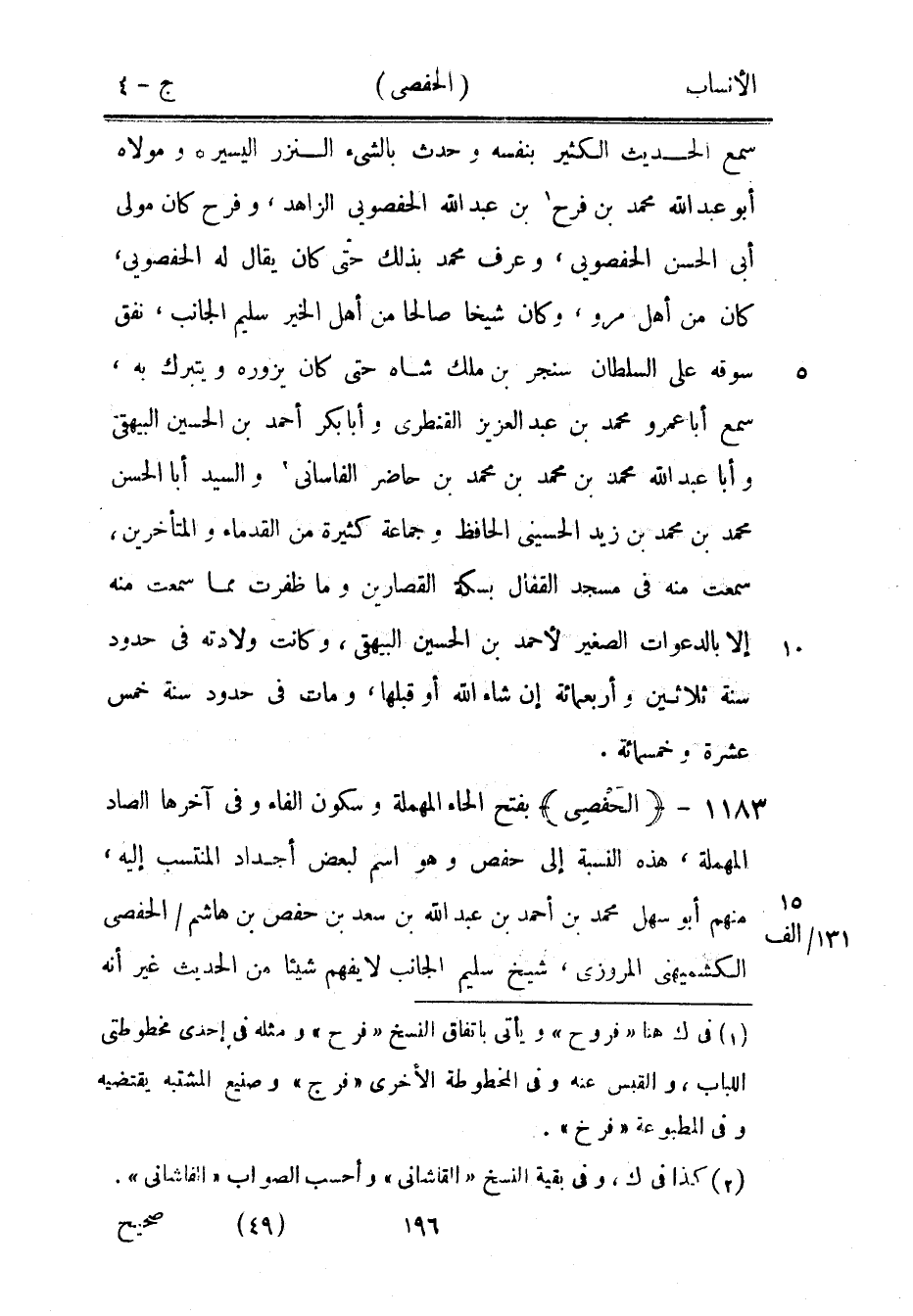 سمع الحديث الكثير بنفسه وحدث بالشيء النزر اليسير ومولاه أبو عبد الله محمد بن فرح [1] بن عبد الله الحفصويى الزاهد، وفرح كان مولى أبى الحسن الحفصويى، وعرف محمد بذلك حتى كان يقال له الحفصويى، كان من أهل مرو، وكان شيخا صالحا من أهل الخير سليم الجانب، نفق سوقه على السلطان سنجر بن ملك شاه حتى كان يزوره ويتبرك به، سمع أبا عمرو محمد بن عبد العزيز القنطري وأبا بكر أحمد بن الحسين البيهقي وأبا عبد الله محمد بن محمد بن محمد بن حاضر الفاسانى [2] والسيد أبا الحسن محمد بن محمد بن زيد الحسيني الحافظ وجماعة كثيرة من القدماء والمتأخرين، سمعت منه في مسجد القفال بسكة القصارين وما ظفرت مما سمعت منه إلا بالدعوات الصغير لأحمد بن الحسين البيهقي، وكانت ولادته في حدود سنة ثلاثين وأربعمائة إن شاء الله أو قبلها، ومات في حدود سنة خمس عشرة وخمسمائة.