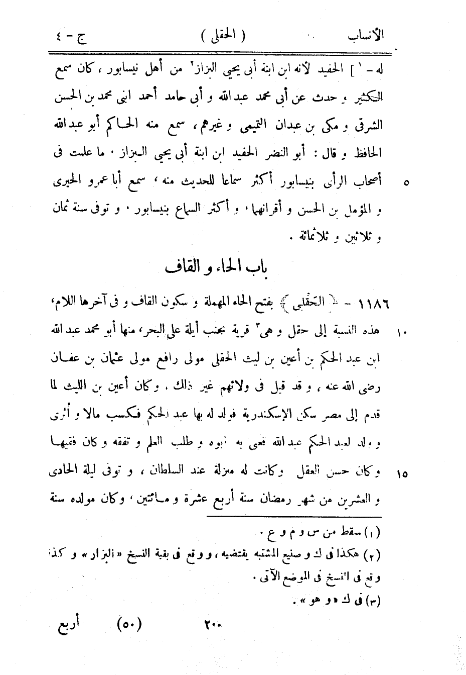 بفتح الحاء المهملة وسكون القاف وفي آخرها اللام، هذه النسبة إلى حقل وهي [3] قرية بجنب أيلة على البحر، منها أبو محمد عبد الله ابن عبد الحكم بن أعين بن ليث الحقلى مولى رافع مولى عثمان بن عفان رضى الله عنه، وقد قيل في ولائهم غير ذلك، وكان أعين بن الليث لما قدم إلى مصر سكن الإسكندرية فولد له بها عبد الحكم فكسب مالا وأثرى وولد لعبد الحكم عبد الله فعنى به أبوه وطلب العلم وتفقه وكان فقيها وكان حسن العقل وكانت له منزلة عند السلطان، وتوفى ليلة الحادي والعشرين من شهر رمضان سنة أربع عشرة ومائتين، وكان مولده سنة