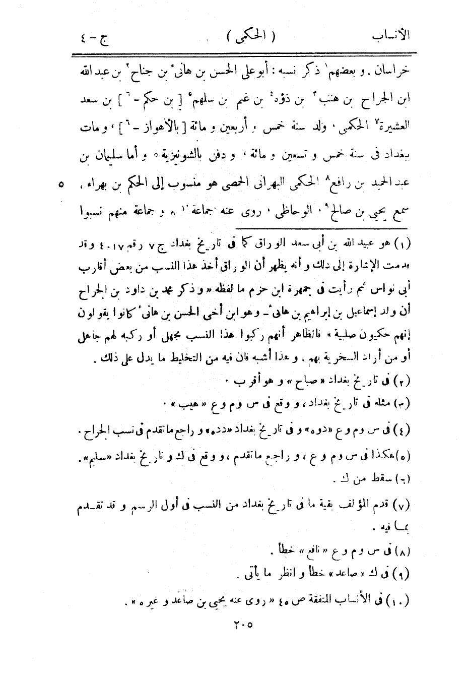 [1] هو عبيد الله بن أبى سعد الوراق كما في تاريخ بغداد ج 7 رقم 4017 وقد قدمت الإشارة إلى ذلك وأنه يظهر أن الوراق أخذ هذا النسب من بعض أقارب أبى نواس ثم رأيت في جمهرة ابن حزم ما لفظه «وذكر محمد بن داود بن الجراح أن ولد إسماعيل بن إبراهيم بن هانئ- وهو ابن أخى الحسن بن هانئ كانوا يقولون إنهم حكميون صلبية» فالظاهر أنهم ركبوا هذا النسب بجهل أو ركبه لهم جاهل أو من أراد السخرية بهم، وهذا أشبه فان فيه من التخليط ما يدل على ذلك.