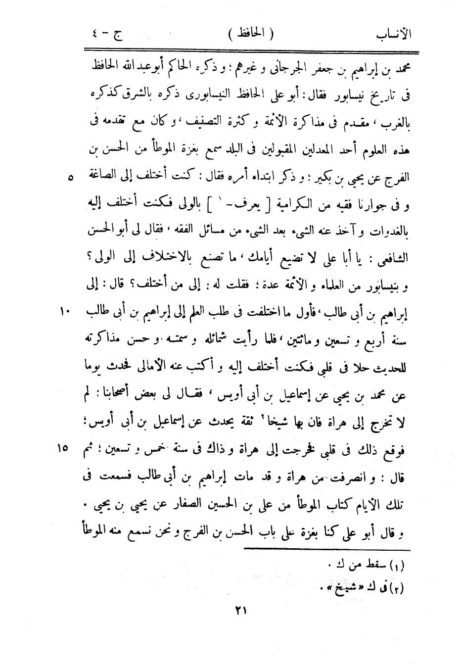 وبنيسابور من العلماء والأئمة عدة، فقلت له: إلى من أختلف؟ قال: إلى إبراهيم بن أبى طالب، فأول ما اختلفت في طلب العلم إلى إبراهيم بن أبى طالب سنة أربع وتسعين ومائتين، فلما رأيت شمائله وسمته وحسن مذاكرته للحديث حلا في قلبي فكنت أختلف إليه وأكتب عنه الأمالي فحدث يوما عن محمد بن يحيى عن إسماعيل بن أبى أويس، فقال لي بعض أصحابنا: لم لا تخرج إلى هراة فان بها شيخا [2] ثقة يحدث عن إسماعيل بن أبى أويس، فوقع ذلك في قلبي فخرجت إلى هراة وذاك في سنة خمس وتسعين، ثم قال: وانصرفت من هراة وقد مات إبراهيم بن أبى طالب فسمعت في تلك الأيام كتاب الموطأ من على بن الحسين الصفار عن يحيى بن يحيى.