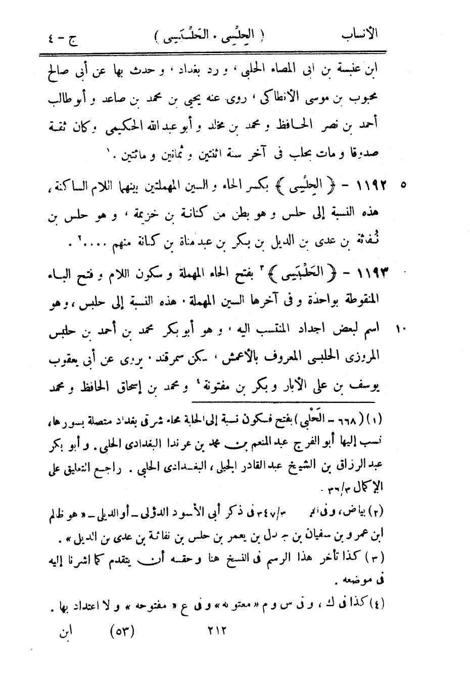 [3] بفتح الحاء المهملة وسكون اللام وفتح الباء المنقوطة بواحدة وفي آخرها السين المهملة، هذه النسبة إلى حلبس، وهو اسم لبعض أجداد المنتسب اليه، وهو أبو بكر محمد بن أحمد بن حلبس المروزي الحلبسى المعروف بالأعمش، سكن سمرقند، يروى عن أبى يعقوب يوسف بن على الأبار وبكر بن مفتونة [4] ومحمد بن إسحاق الحافظ ومحمد