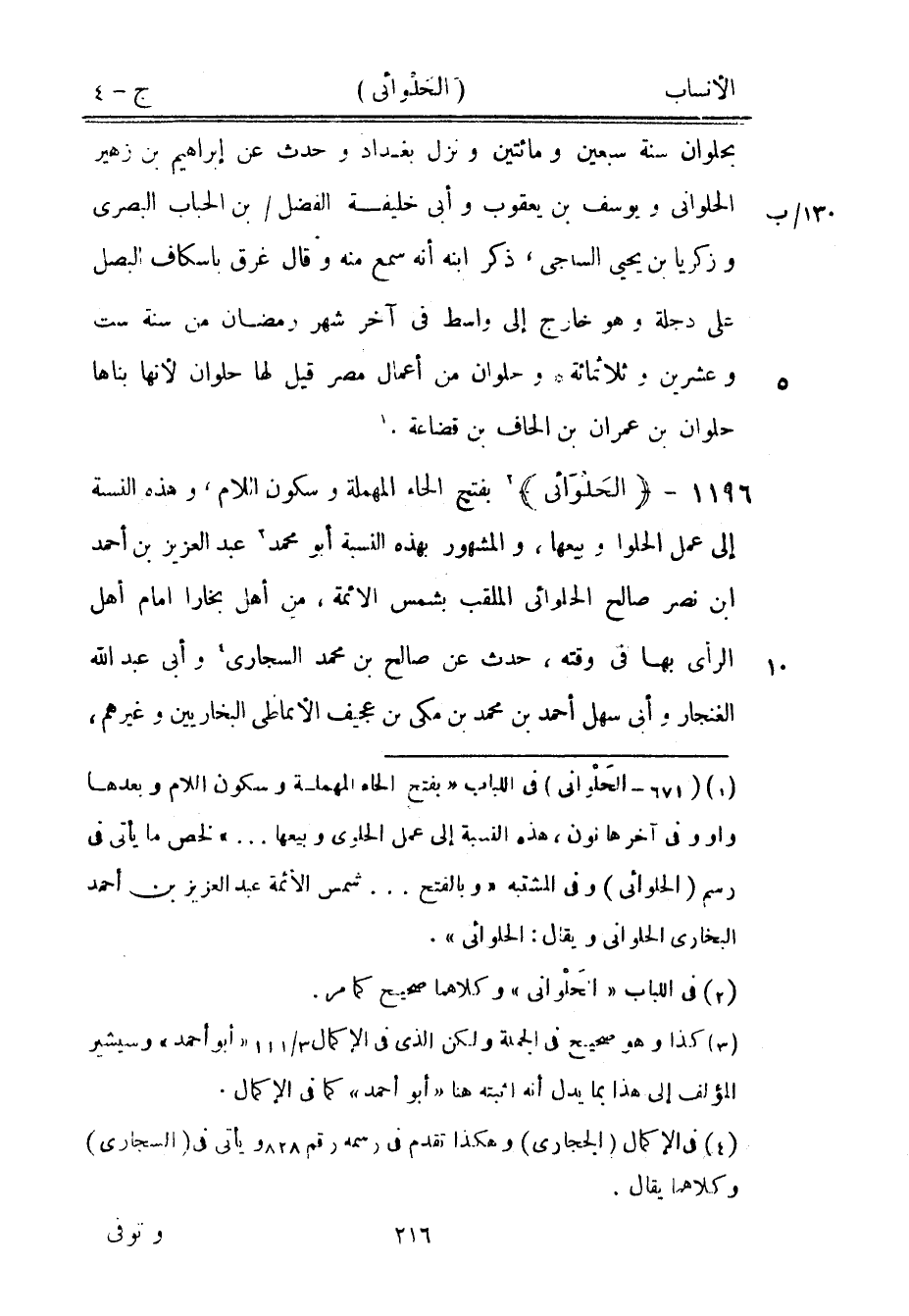 [2] بفتح الحاء المهملة وسكون اللام، وهذه النسبة إلى عمل الحلواء وبيعها، والمشهور بهذه النسبة أبو محمد [3] عبد العزيز بن أحمد ابن نصر صالح الحلوائى الملقب بشمس الائمة، من أهل بخارا امام أهل الرأى بها في وقته، حدث عن صالح بن محمد السجارى [4] وأبى عبد الله الغنجار وأبى سهل أحمد بن محمد بن مكي بن عجيف الأنماطي البخاريين وغيرهم،