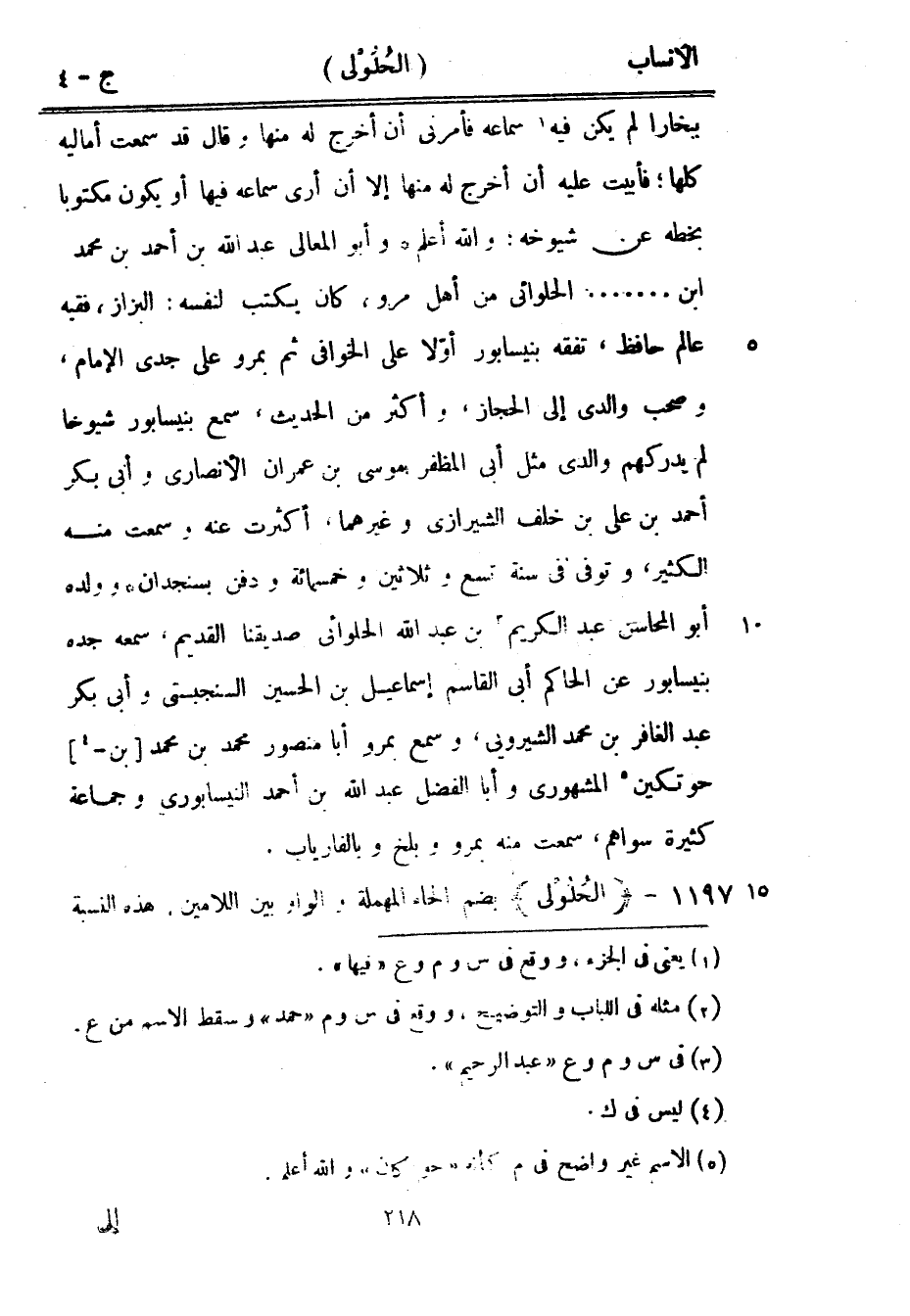 ببخارا لم يكن فيه [1] سماعه فأمرنى أن أخرج له منها وقال قد سمعت أماليه كلها، فأبيت عليه أن أخرج له منها إلا أن أرى سماعه فيها أو يكون مكتوبا بخطه عن شيوخه، والله أعلم وأبو المعالي عبد الله بن أحمد بن محمد ابن..... [2] الحلوائى من أهل مرو، كان يكتب لنفسه: البزاز، فقيه عالم حافظ، تفقه بنيسابور أوّلا على الخوافي ثم بمرو على جدي الإمام، وصحب والدي إلى الحجاز، وأكثر من الحديث، سمع بنيسابور شيوخا لم يدركهم والدي مثل أبى المظفر بموسى بن عمران الأنصاري وأبى بكر أحمد بن على بن خلف الشيرازي وغيرهما، أكثرت عنه وسمعت منه الكثير، وتوفى في سنة تسع وثلاثين وخمسمائة ودفن بسنجدان وولده أبو المحاسن عبد الكريم [3] بن عبد الله الحلوائى صديقنا القديم، سمعه جده بنيسابور عن الحاكم أبى القاسم إسماعيل بن الحسين السنجبستى وأبى بكر عبد الغافر بن محمد الشيرويى، وسمع بمرو أبا منصور محمد بن محمد [بن-[4]] حوتكين [5] المشهورى وأبا الفضل عبد الله بن أحمد النيسابورىّ وجماعة كثيرة سواهم، سمعت منه بمرو وبلخ وبالفارياب.