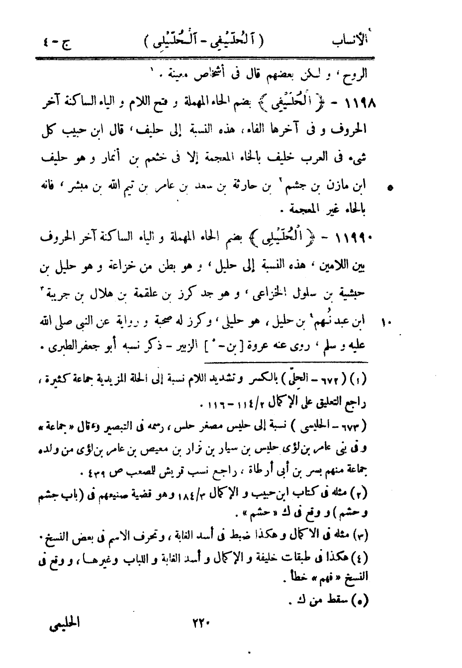 (673- الحليسي) نسبة إلى حليس مصغر حلس، رسمه في التبصير وقال «جماعة» وفي بنى عامر بن لؤيّ حليس بن سيار بن نزار بن معيص بن عامر بن لؤيّ من ولده جماعة منهم بسر بن أبى أرطاة، راجع نسب قريش للمصعب ص 439.