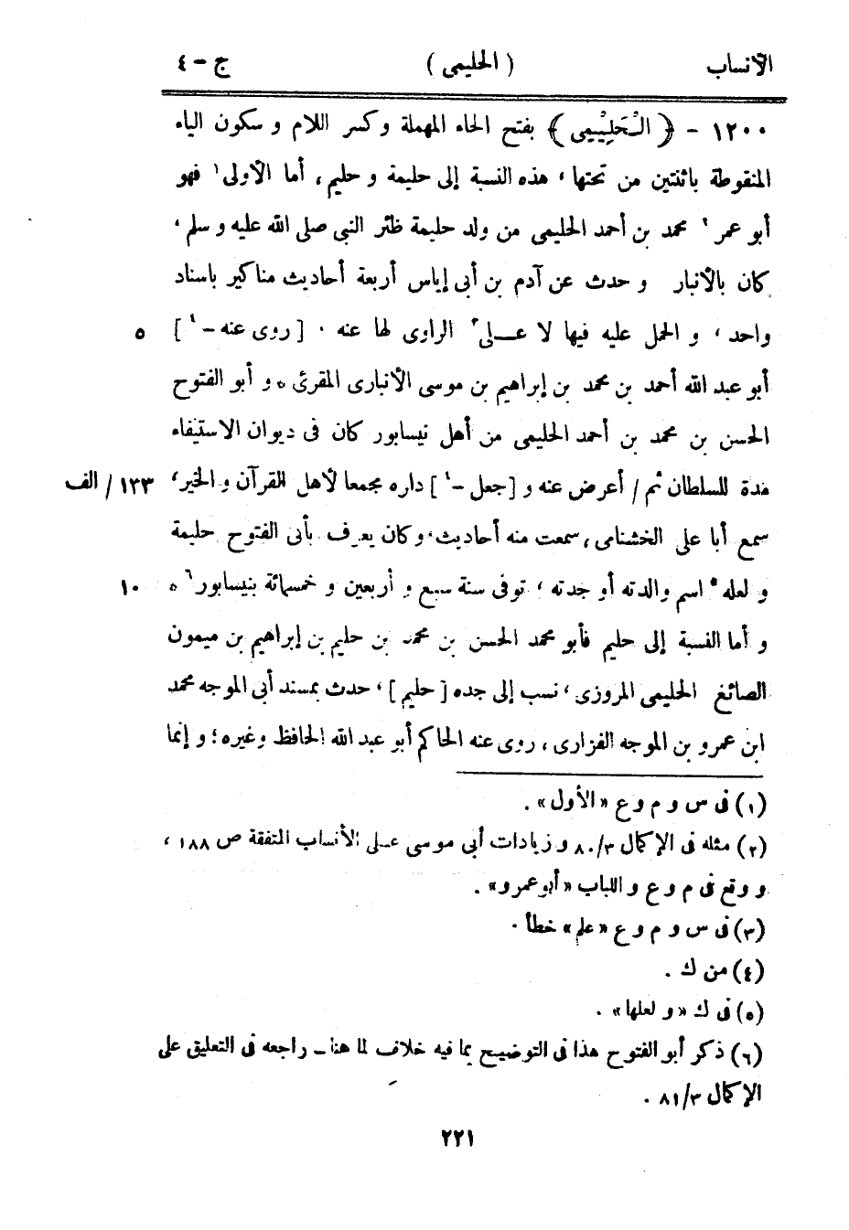 بفتح الحاء المهملة وكسر اللام وسكون الياء المنقوطة باثنتين من تحتها، هذه النسبة إلى حليمة وحليم، أما الأولى [1] فهو أبو عمر [2] محمد بن أحمد الحليمي من ولد حليمة ظئر النبي صلى الله عليه وسلم، كان بالأنبار وحدث عن آدم بن أبى إياس أربعة أحاديث مناكير باسناد واحد، والحمل عليه فيها لا على [3] الراويّ لها عنه، [روى عنه-[4]] أبو عبد الله أحمد بن محمد بن إبراهيم بن موسى الأنباري المقرئ وأبو الفتوح الحسن بن محمد بن أحمد الحليمي من أهل نيسابور كان في ديوان الاستيفاء مدة للسلطان ثم/ أعرض عنه و [جعل-[4]] داره مجمعا لأهل القرآن والخير، سمع أبا على الخشنامى، سمعت منه أحاديث، وكان يعرف بأبي الفتوح حليمة ولعله [5] اسم والدته أو جدته، توفى سنة سبع وأربعين وخمسمائة بنيسابور [6] وأما النسبة إلى حليم فأبو محمد الحسن بن محمد بن حليم بن إبراهيم بن ميمون الصائغ الحليمي المروزي، نسب إلى جده [حليم] ، حدث بمسند أبى الموجه محمد ابن عمرو بن الموجه الفزاري، روى عنه الحاكم أبو عبد الله الحافظ وغيره، وإنما