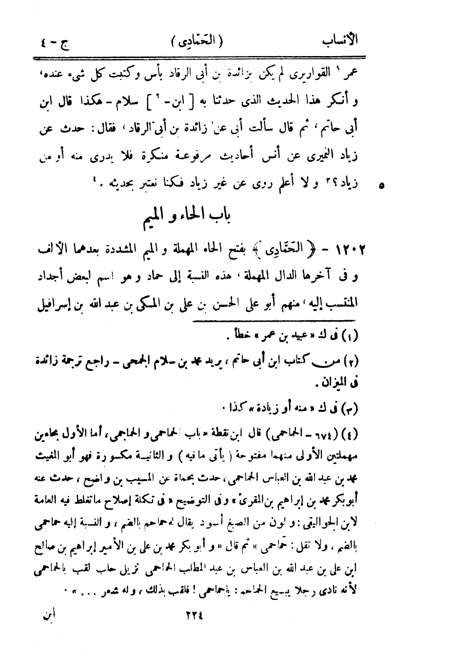 [4] (674- الحماحمى) قال ابن نقطة «باب الحماحمى والحماجمى، أما الأول بحاءين مهملتين الأولى منهما مفتوحة (يأتى ما فيه) والثانية مكسورة فهو أبو المغيث محمد بن عبد الله بن العباس الحماحمى، حدث بحماة عن المسيب بن واضح، حدث عنه أبو بكر محمد بن إبراهيم بن المقرئ» وفي التوضيح «في تكملة إصلاح ما تغلط فيه العامة لابن الجواليقيّ: ولون من الصبغ أسود يقال له حماحم بالضم، والنسبة إليه حماحمى بالضم، ولا تقل: حمّاحمى» ثم قال «وأبو بكر محمد بن على بن الأمير إبراهيم بن صالح ابن على بن عبد الله بن العباس بن عبد المطلب الحماحمى نزيل حلب لقب بالحماحمى لأنه نادى رجلا يبيع الحماحم: يا حماحمى! فلقب بذلك، وله شعر....» .