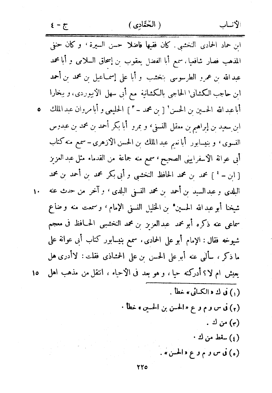 ابن حماد الحمادي النخشبى، كان فقيها فاضلا حسن السيرة، وكان حنفي المذهب فصار شافعيا، سمع أبا الفضل يعقوب بن إسحاق السلامي وأبا محمد عبد الله بن عمرو الطرسوسي بنخشب وأبا على إسماعيل بن محمد بن أحمد ابن حاجب الكشاني [1] الحاجبي بالكشانية مع أبى سهل الأبيوردي، وببخارا أبا عبد الله الحسين بن الحسن [2] [بن محمد-[3]] الحليمي وأبا مروان عبد الملك ابن سعيد بن إبراهيم بن معقل النسفي، وبمرو أبا بكر أحمد بن محمد بن عبدوس النسوي، وبنيسابور أبا نعيم عبد الملك بن الحسن الأزهري- سمع منه كتاب أبى عوانة الأسفراييني الصحيح، سمع منه جماعة من القدماء مثل عبد العزيز [ابن-[4]] محمد بن محمد الحافظ النخشبى وأبى بكر محمد بن أحمد بن محمد البلدي وعبد السيد بن أحمد بن محمد النسفي البلدي، وآخر من حدث عنه شيخنا أبو عبد الله الحسين [5] بن الخليل النسفي الإمام، وسمعت منه وضاع سماعي عنه ذكره أبو محمد عبد العزيز بن محمد النخشبى الحافظ في معجم شيوخه فقال: الإمام أبو على الحمادي، سمع بنيسابور كتاب أبى عوانة على ما ذكر، سألني عنه أبو على الحسن بن على الحمشاذى فقلت: لا أدرى هل يعيش أم لا؟ أدركته حيا، وهو بعد في الأحياء، انتقل من مذهب أهل