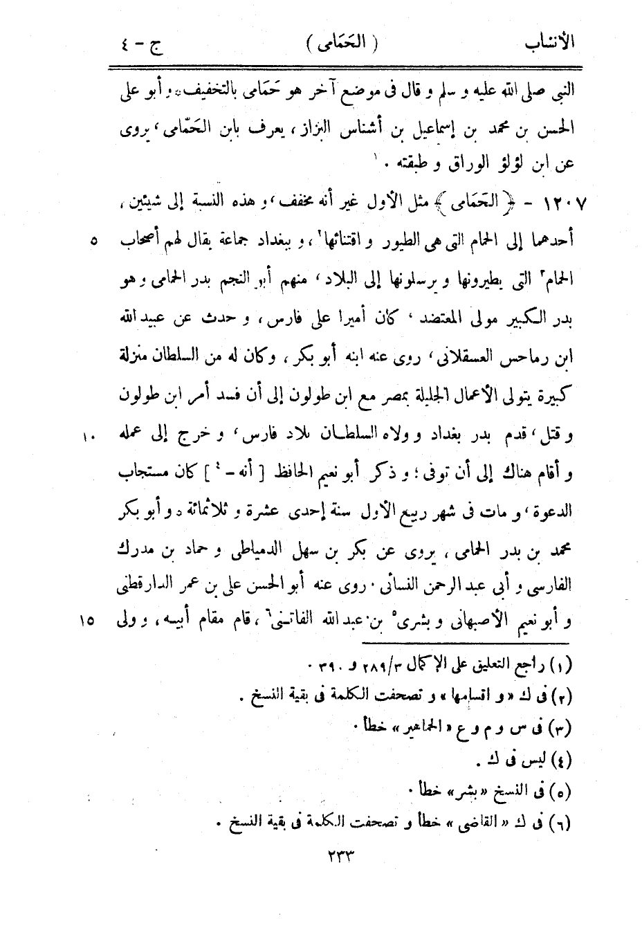 النبي صلى الله عليه وسلم وقال في موضع آخر هو حمامي بالتخفيف وأبو على الحسن بن محمد بن إسماعيل بن أشناس البزاز، يعرف بابن الحمّامى، يروى عن ابن لؤلؤ الوراق وطبقته. [1]