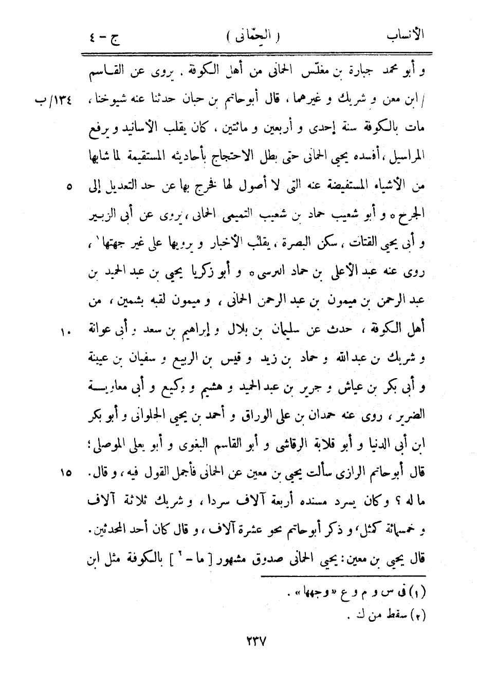 وأبو محمد جبارة بن مغلّس الحماني من أهل الكوفة. يروى عن القاسم ابن معن وشريك وغيرهما، قال أبو حاتم بن حبان حدثنا عنه شيوخنا، مات بالكوفة سنة إحدى وأربعين ومائتين، كان يقلب الأسانيد ويرفع المراسيل، أفسده يحيى الحماني حتى بطل الاحتجاج بأحاديثه المستقيمة لما شابها من الأشياء المستفيضة عنه التي لا أصول لها فخرج بها عن حد التعديل إلى الجرح وأبو شعيب حماد بن شعيب التميمي الحماني، يروى عن أبى الزبير وأبى يحيى القتات، سكن البصرة، يقلب الأخبار ويرويها على غير جهتها [1] ، روى عنه عبد الأعلى بن حماد النرسي وأبو زكريا يحيى بن عبد الحميد بن عبد الرحمن بن ميمون بن عبد الرحمن الحماني، وميمون لقبه بشمين، من أهل الكوفة، حدث عن سليمان بن بلال وإبراهيم بن سعد وأبى عوانة وشريك بن عبد الله وحماد بن زيد وقيس بن الربيع وسفيان بن عيينة وأبى بكر بن عياش وجرير بن عبد الحميد وهشيم ووكيع وأبى معاوية الضرير، روى عنه حمدان بن على الوراق وأحمد بن يحيى الحلواني وأبو بكر ابن أبى الدنيا وأبو قلابة الرقاشيّ وأبو القاسم البغوي وأبو يعلى الموصلي، قال أبو حاتم الرازيّ سألت يحيى بن معين عن الحماني فأجمل القول فيه، وقال.