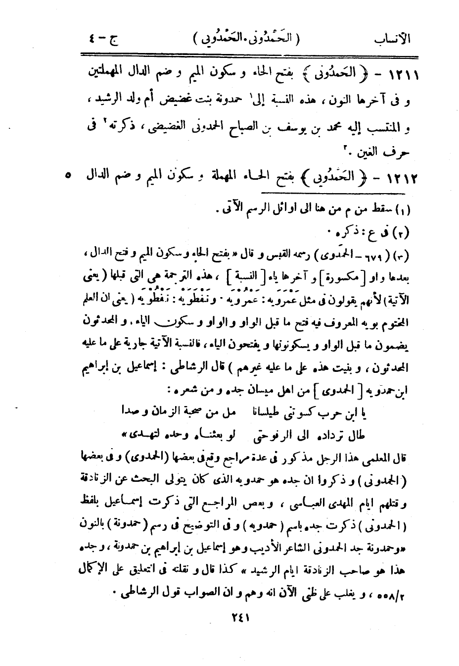 [3] (679- الحمدويّ) رسمه القبس وقال «بفتح الحاء وسكون الميم وفتح الدال، بعدها واو [مكسورة] وآخرها ياء [النسبة] ، هذه الترجمة هي التي قبلها (يعنى الآتية) لأنهم يقولون في مثل عمرويه: عمرويه. ونفطويه: نفطويه (يعنى ان العلم المختوم بويه المعروف فيه فتح ما قبل الواو والواو وسكون الياء، والمحدثون يضمون ما قبل الواو ويسكنونها ويفتحون الياء، فالنسبة الآتية جارية على ما عليه المحدثون، وبنيت هذه على ما عليه غيرهم) قال الرشاطى: إسماعيل بن إبراهيم ابن حمدويه [الحمدويّ] من أهل ميسان جده ومن شعره: