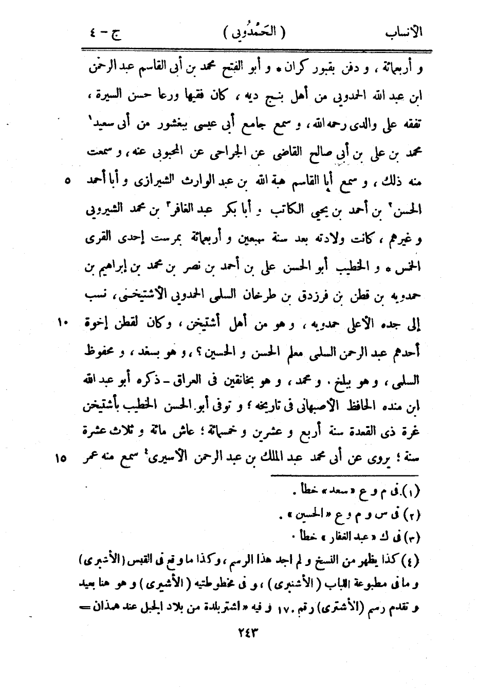 وأربعمائة، ودفن بقبور كران وأبو الفتح محمد بن أبى القاسم عبد الرحمن ابن عبد الله الحمدوييّ من أهل بنج ديه، كان فقيها ورعا حسن السيرة، تفقه على والدي رحمه الله، وسمع جامع أبى عيسى ببغشور من أبى سعيد [1] محمد بن على بن أبى صالح القاضي عن الجراحي عن المحبوبي عنه، وسمعت منه ذلك، وسمع أبا القاسم هبة الله بن عبد الوارث الشيرازي وأبا أحمد الحسن [2] بن أحمد بن يحيى الكاتب وأبا بكر عبد الغافر [3] بن محمد الشيرويى وغيرهم، كانت ولادته بعد سنة سبعين وأربعمائة بمرست إحدى القرى الخمس والخطيب أبو الحسن على بن أحمد بن نصر بن محمد بن إبراهيم بن حمدويه بن قطن بن فرزدق بن طرخان السلمي الحمدوييّ الإشتيخني، نسب إلى جده الأعلى حمدويه، وهو من أهل إشتيخن، وكان لقطن إخوة أحدهم عبد الرحمن السلمي معلم الحسن والحسين؟، وهو بسغد، ومحفوظ السلمي، وهو ببلخ، ومحمد، وهو بخانقين في العراق- ذكره أبو عبد الله ابن مندة الحافظ الأصبهاني في تاريخه، وتوفى أبو الحسن الخطيب بأشتيخن غرة ذي القعدة سنة أربع وعشرين وخمسمائة، عاش مائة وثلاث عشرة سنة، يروى عن أبى محمد عبد الملك بن عبد الرحمن الأسيرى [4] سمع منه عمر