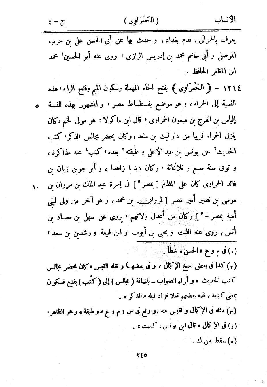 بفتح الحاء المهملة وسكون الميم وفتح الراء، هذه النسبة إلى الحمراء، وهو موضع بفسطاط مصر، والمشهور بهذه النسبة إلياس بن الفرج بن ميمون الحمراويّ، قال ابن ماكولا: هو مولى لخم، كان ينزل الحمراء قريبا من دار ليث بن سعد، وكان يحضر مجالس الذكر، كتب الحديث [2] عن يونس بن عبد الأعلى وطبقته [3] بعده، كتب [4] عنه مذاكرة، وتوفى سنة سبع وثلاثمائة. وكان دينا زاهدا وأبو جوين زبان بن فائد الحمراويّ كان على المظالم [بمصر [5]] في إمرة عبد الملك بن مروان بن موسى بن نصير أمير مصر [لمروان بن محمد، وهو آخر من ولى لبني أمية بمصر-[5]] وكان من أعدل ولاتهم، يروى عن سهل بن معاذ بن أنس، روى عنه الليث ويحيى بن أيوب وابن لهيعة ورشدين بن سعد،