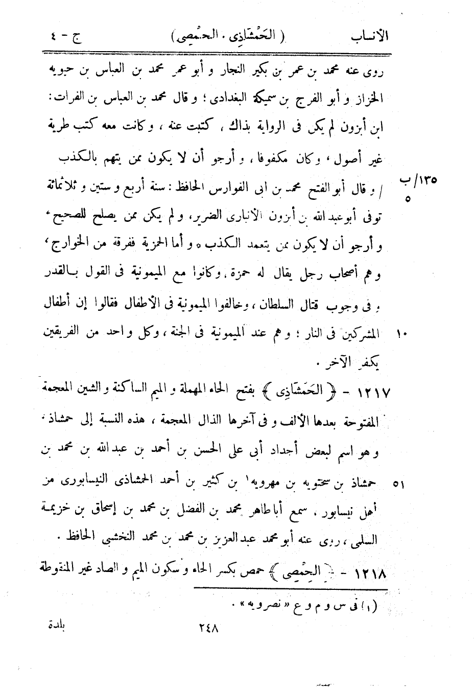 ابن أبزون لم يكن في الرواية بذاك، كتبت عنه، وكانت معه كتب طرية غير أصول، وكان مكفوفا، وأرجو أن لا يكون ممن يتهم بالكذب 135/ ب وقال أبو الفتح محمد بن ابى الفوارس الحافظ: سنة أربع وستين وثلاثمائة توفى أبو عبد الله بن أبزون الأنباري الضرير، ولم يكن ممن يصلح للصحيح، وأرجو أن لا يكون ممن يتعمد الكذب وأما الحمزية ففرقة من الخوارج، وهم أصحاب رجل يقال له حمزة، وكانوا مع الميمونية في القول بالقدر وفي وجوب قتال السلطان، وخالفوا الميمونية في الأطفال فقالوا إن أطفال المشركين في النار، وهم عند الميمونية في الجنة، وكل واحد من الفريقين يكفر الآخر.