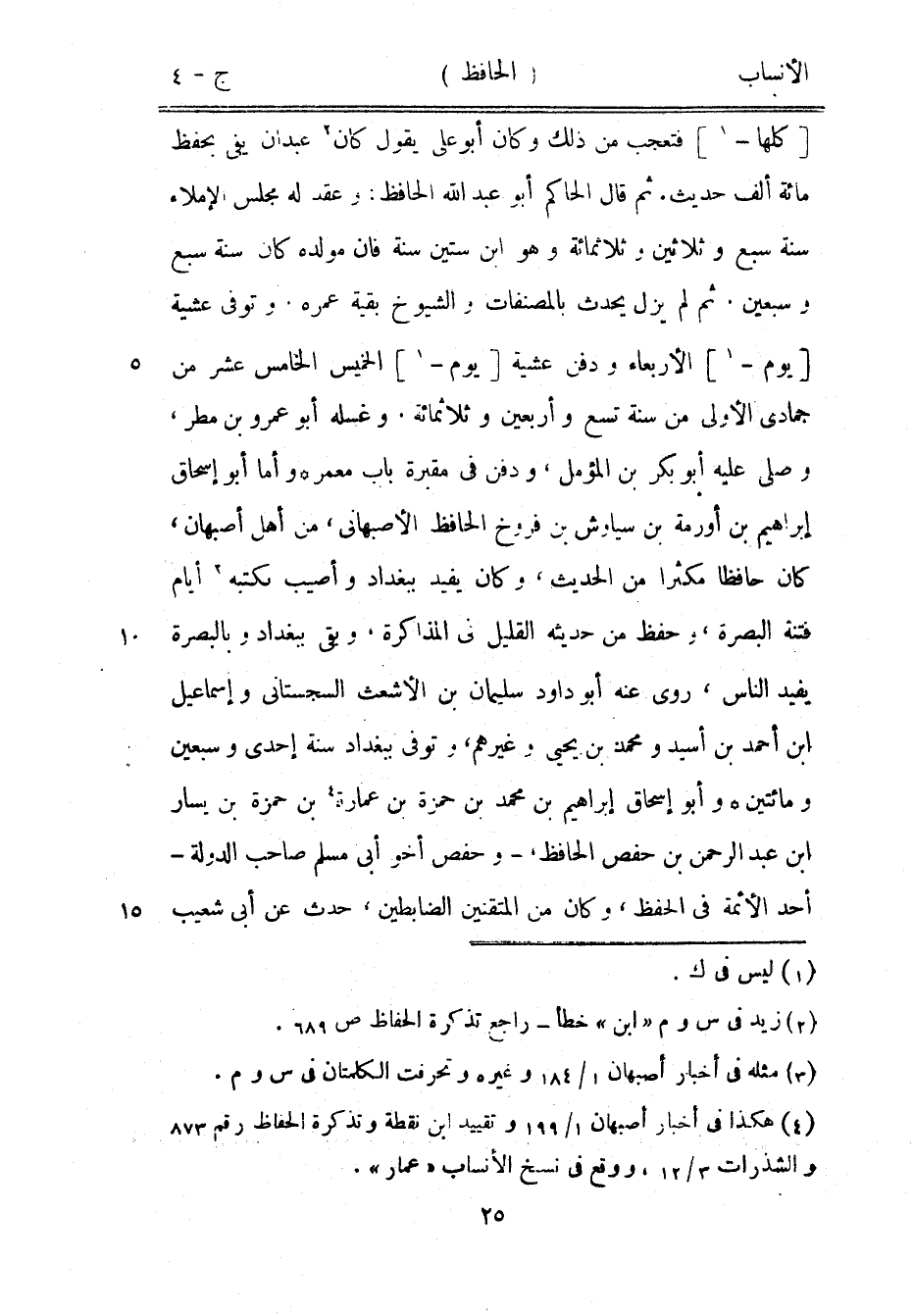 [4] هكذا في أخبار أصبهان 1/ 199 وتقييد ابن نقطة وتذكرة الحفاظ رقم 873 والشذرات 3/ 12، ووقع في نسخ الأنساب «عمار» .