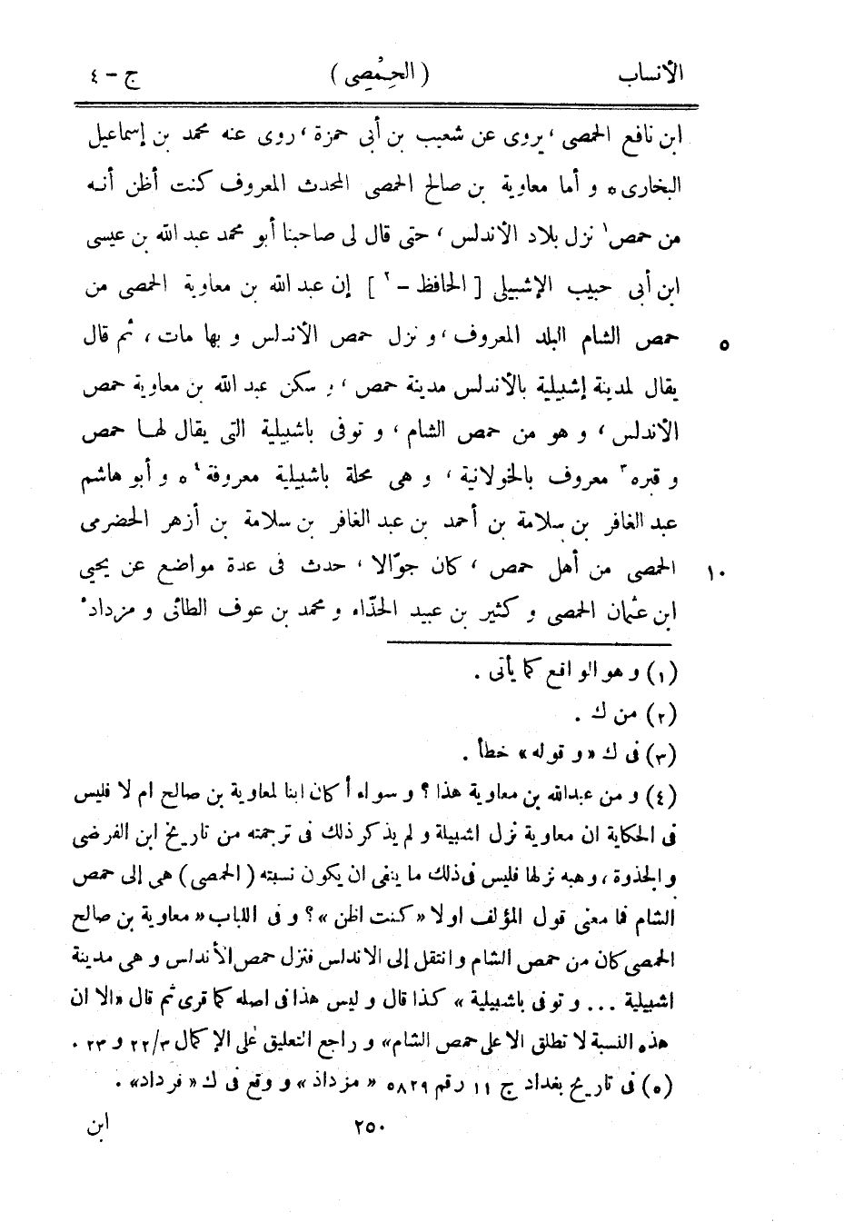 [4] ومن عبد الله بن معاوية هذا؟ وسواء أكان ابنا لمعاوية بن صالح أم لا فليس في الحكاية ان معاوية نزل اشبيلية ولم يذكر ذلك في ترجمته من تاريخ ابن الفرضيّ والجذوة، وهبه نزلها فليس في ذلك ما ينفى ان يكون نسبته (الحمصي) هي إلى حمص الشام فما معنى قول المؤلف أولا «كنت أظن» ؟ وفي اللباب «معاوية بن صالح الحمصي كان من حمص الشام وانتقل إلى الأندلس فنزل حمص الأندلس وهي مدينة اشبيلية ... وتوفى بإشبيلية» كذا قال وليس هذا في أصله كما قرى ثم قال «الا ان هذه النسبة لا تطلق الا على حمص الشام» وراجع التعليق على الإكمال 3/ 22 و 23.