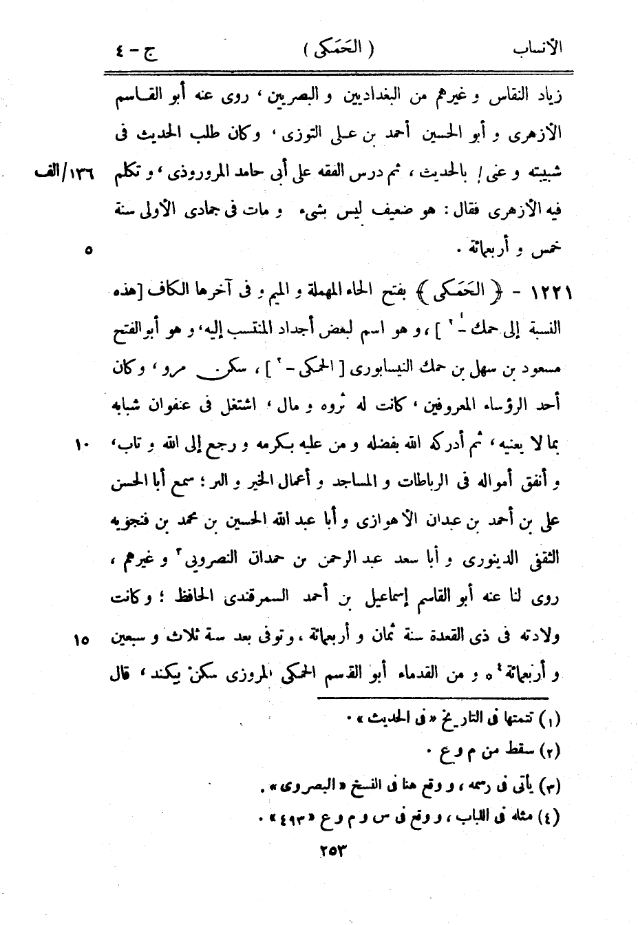 بفتح الحاء المهملة والميم وفي آخرها الكاف [هذه النسبة إلى حمك-[2]] ، وهو اسم لبعض أجداد المنتسب إليه، وهو أبو الفتح مسعود بن سهل بن حمك النيسابورىّ [الحمكى-[2]] ، سكن مرو، وكان أحد الرؤساء المعروفين، كانت له ثروه ومال، اشتغل في عنفوان شبابه بما لا يعنيه، ثم أدركه الله بفضله ومن عليه بكرمه ورجع إلى الله وتاب، وأنفق أمواله في الرباطات والمساجد وأعمال الخير والبر، سمع أبا الحسن على بن أحمد بن عبدان الأهوازي وأبا عبد الله الحسين بن محمد بن فنجويه الثقفي الدينَوَريّ وأبا سعد عبد الرحمن بن حمدان النصرويى [3] وغيرهم، روى لنا عنه أبو القاسم إسماعيل بن أحمد السمرقندي الحافظ، وكانت ولادته في ذي القعدة سنة ثمان وأربعمائة، وتوفى بعد سنة ثلاث وسبعين وأربعمائة [4] ومن القدماء أبو القاسم الحمكى المروزي سكن بيكند، قال