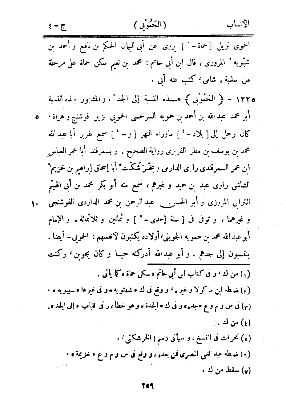 هذه النسبة إلى الجد [3] ، والمشهور بهذه النسبة أبو محمد عبد الله بن أحمد بن حمويه السرخسي الحمويى نزيل فوشنج وهراة، كان رحل إلى [بلاد-[4]] ما وراء النهر [و-[4]] سمع بفربر أبا عبد الله محمد بن يوسف بن مطر الفربري رواية الصحيح، وبسمرقند أبا عمر العباس ابن عمر السمرقندي رازي الدارميّ وبخرشكت [5] أبا إسحاق إبراهيم بن خزيم [6] الشاشي راوي عبد بن حميد وغيرهم، سمع منه أبو بكر محمد بن أبى الهيثم الترابي المروزي وأبو الحسن عبد الرحمن بن محمد الداوديّ الفوشنجى وغيرهما، وتوفى في [سنة إحدى-[7]] وثمانين وثلاثمائة والإمام أبو عبد الله محمد بن حمويه الجويني، أولاده يكتبون لأنفسهم: الحمويى- أيضا.