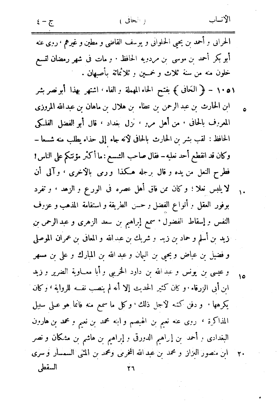 بفتح الحاء المهملة والفاء، اشتهر بهذا أبو نصر بشر ابن الحارث بن عبد الرحمن بن عطاء بن هلال بن ماهان بن عبد الله المروزي المعروف بالحافي، من أهل مرو، نزل بغداد، قال أبو الفضل الفلكي الحافظ: لقب بشر بن الحارث بالحافي لأنه جاء إلى حذاء يطلب منه شسعا- وكان قد انقطع أحد نعليه- فقال صاحب الشسع: ما أكثر مؤنتكم على الناس! فطرح النعل من يده وقال برجله هكذا ورمى بالأخرى، وآلى أن لا يلبس نعلا، وكان ممن فاق أهل عصره في الورع والزهد، وتفرد بوفور العقل وأنواع الفضل وحسن الطريقة واستقامة المذهب وعزوف النفس وإسقاط الفضول، سمع إبراهيم بن سعد الزهري وعبد الرحمن بن زيد بن أسلم وحماد بن زيد وشريك بن عبد الله والمعافى بن عمران الموصلي وفضيل بن عياض ويحيى بن اليمان وعبد الله بن المبارك وعلى بن مسهر وعيسى بن يونس وعبد الله بن داود الخريبى وأبا معاوية الضرير وزيد ابن أبى الزرقاء، وكان كثير الحديث إلا أنه لم ينصب نفسه للرواية، وكان يكرهها، ودفن كتبه لأجل ذلك، وكل ما سمع منه فإنما هو على سبيل المذاكرة، روى عنه نعيم بن الهيصم وابنه محمد بن نعيم ومحمد بن هارون البغدادي وأحمد بن إبراهيم الدورقي وإبراهيم بن هاشم بن مشكان ونصر ابن منصور البزاز ومحمد بن عبد الله المخرمي ومحمد بن المثنى السمسار وسرى