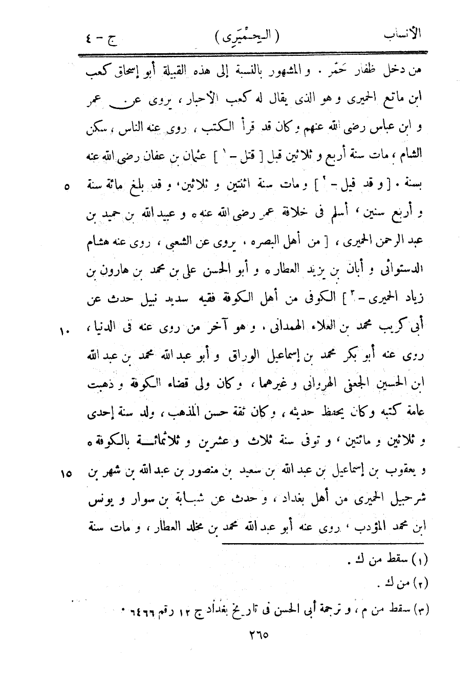 من دخل ظفار حمّر. والمشهور بالنسبة إلى هذه القبيلة أبو إسحاق كعب ابن ماتع الحميري وهو الّذي يقال له كعب الأحبار، يروى عن عمر وابن عباس رضى الله عنهم وكان قد قرأ الكتب، روى عنه الناس، سكن الشام، مات سنة أربع وثلاثين قبل [قتل-[1]] عثمان بن عفان رضى الله عنه بسنة. [وقد قيل-[2]] ومات سنة اثنتين وثلاثين، وقد بلغ مائة سنة وأربع سنين، أسلم في خلافة عمر رضى الله عنه وعبيد الله بن حميد بن عبد الرحمن الحميري، [من أهل البصرة، يروى عن الشعبي، روى عنه هشام الدستوائى وأبان بن يزيد العطار وأبو الحسن على بن محمد بن هارون بن زياد الحميري-[3]] الكوفي من أهل الكوفة فقيه سديد نبيل حدث عن أبى كريب محمد بن العلاء الهمدانيّ، وهو آخر من روى عنه في الدنيا، روى عنه أبو بكر محمد بن إسماعيل الوراق وأبو عبد الله محمد بن عبد الله ابن الحسين الجعفي الهروانى وغيرهما، وكان ولى قضاء الكوفة وذهبت عامة كتبه وكان يحفظ حديثه، وكان ثقة حسن المذهب، ولد سنة إحدى وثلاثين ومائتين، وتوفى سنة ثلاث وعشرين وثلاثمائة بالكوفة ويعقوب بن إسماعيل بن عبد الله بن سعيد بن منصور بن عبد الله بن شهر بن شرحبيل الحميري من أهل بغداد، وحدث عن شبابة بن سوار ويونس ابن محمد المؤدب، روى عنه أبو عبد الله محمد بن مخلد العطار، ومات سنة