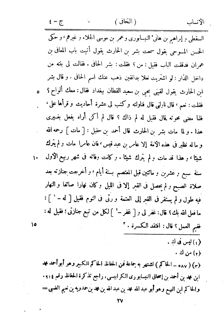 السقطي وإبراهيم بن هانئ النيسابورىّ وعمر بن موسى الجلاء وغيرهم، وحكى الحسن المسوحي يقول سمعت بشر بن الحارث يقول أتيت باب المعافى بن عمران فدققت الباب فقيل: من؟ فقلت: بشر الحافى. فقالت لي بنته من داخل الدار: لو اشتريت نعلا بدانقين ذهب عنك اسم الحافى. وقال بشر ابن الحارث يقول لقيني يحيى بن سعيد القطان ببغداد فقال: معك ألواح؟