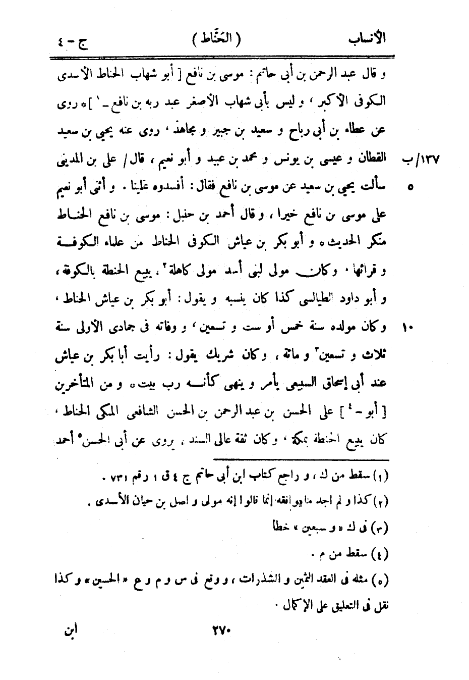 وقال عبد الرحمن بن أبى حاتم: موسى بن نافع [أبو شهاب الحناط الأسدي الكوفي الأكبر، وليس بأبي شهاب الأصغر عبد ربه بن نافع-[1]] روى عن عطاء بن أبى رباح وسعيد بن جبير ومجاهد، روى عنه يحيى بن سعيد القطان وعيسى بن يونس ومحمد بن عبيد وأبو نعيم، قال/ على بن المديني سألت يحيى بن سعيد عن موسى بن نافع فقال: أفسدوه علينا. وأثنى أبو نعيم على موسى بن نافع خيرا، وقال أحمد بن حنبل: موسى بن نافع الحناط منكر الحديث وأبو بكر بن عياش الكوفي الحناط من علماء الكوفة وقرائها، وكان مولى لبني أسد مولى كاهلة [2] ، يبيع الحنطة بالكوفة، وأبو داود الطيالسي كذا كان ينسبه ويقول: أبو بكر بن عياش الحناط، وكان مولده سنة خمس أو ست وتسعين، ووفاته في جمادى الأولى سنة ثلاث وتسعين [3] ومائة، وكان شريك يقول: رأيت أبا بكر بن عياش عند أبى إسحاق السبيعي يأمر وينهى كأنه رب بيت ومن المتأخرين [أبو-[4]] على الحسن بن عبد الرحمن بن الحسن الشافعيّ المكيّ الحناط، كان يبيع الحنطة بمكة، وكان ثقة عالى السند، يروى عن أبى الحسن [5] أحمد