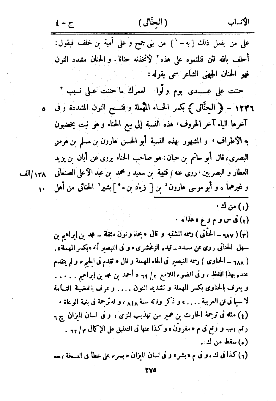 [3] (687- الحنانى) رسمه المشتبه وقال «بحاء ونون مثقلة- محمد بن إبراهيم بن سهل الحنائى روى عن مسدد- قيده الزمخشريّ» وفي التبصير أنه «بكسر المهملة» .