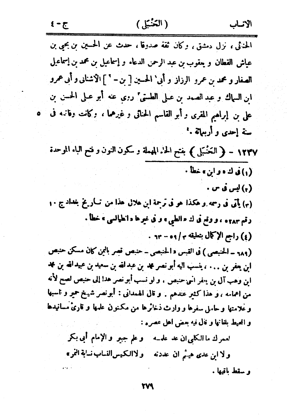 (689- الحنبصى) في القبس «الحنبصى- حنبص قصر باليمن كان مسكن حنبص ابن يعفر بن ... ، ينسب اليه أبو نصر محمد بن عبد الله بن سعيد بن عبيد الله بن محمد ابن وهب آل بن يعفر أخي حنبص، ولو نسب أبو نصر هذا إلى حنبص لصح لأنه من أعمامه، وهذا كثير عندهم. وقال الهمدانيّ: أبو نصر شيخ حمير وناسبها وعلامتها وحامل سفرها ووارث ذخائرها من مكنون علمها وقارئ مسانيدها والمحيط بلغاتها وقال فيه بعض أهل عصره: