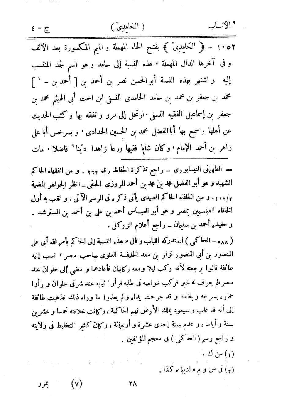 (588- الحاكمى) استدركه اللباب وقال «هذه النسبة إلى الحاكم بأمر الله أبى على المنصور بن أبى المنصور نزار بن معد الخليفة العلويّ صاحب مصر، نسب إليه طائفة قالوا برجعته لأنه ركب ليلا ومعه ركابيان فأعادهما ومضى إلى حلوان عند مصر فلم يعرف له خبر فركب خواصه في طلبه فرأوا ثيابه عند شرقى حلوان ورأوا حماره بسرجه ولجامه وقد جرحت يداه ولم يعلموا ما وراء ذلك فذهبت طائفة إلى أنه قد غاب وسيعود يملك الأرض فهم الحاكمية، وكانت خلافته خمسا وعشرين سنة وأياما، وعدم سنة إحدى عشرة وأربعمائة، وكان كثير التخليط في ولايته وراجع رسم (الحاكمى) في معجم المؤلفين.