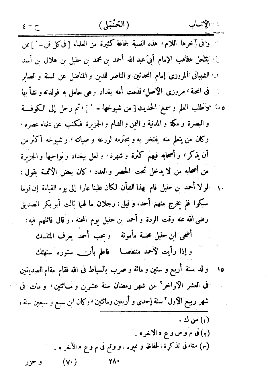 وفي آخرها اللام، هذه النسبة لجماعة كثيرة من العلماء [في كل فن-[1]] ممن ينتحل مذهب الإمام أبى عبد الله أحمد بن محمد بن حنبل بن هلال بن أسد الشيباني المروزي إمام المحدثين والناصر للدين والمناضل عن السنة والصابر في المحنة، مروزى الأصل، قدمت أمه بغداد وهي حامل به فولدته ونشأ بها وطلب العلم وسمع الحديث [من شيوخها-[1]] ، ثم رحل إلى الكوفة والبصرة ومكة والمدينة واليمن والشام والجزيرة فكتب عن علماء عصره، وكان من يتعلم منه يفتخر به ويحترمه لورعه وصيانته، وشيوخه أكثر من أن يذكر، وأصحابه فيهم كثرة وشهرة، ولعل ببغداد ونواحيها والجزيرة من أصحابه من لا يدخل تحت الحصر والعدد، كان بعض الأئمة يقول:
