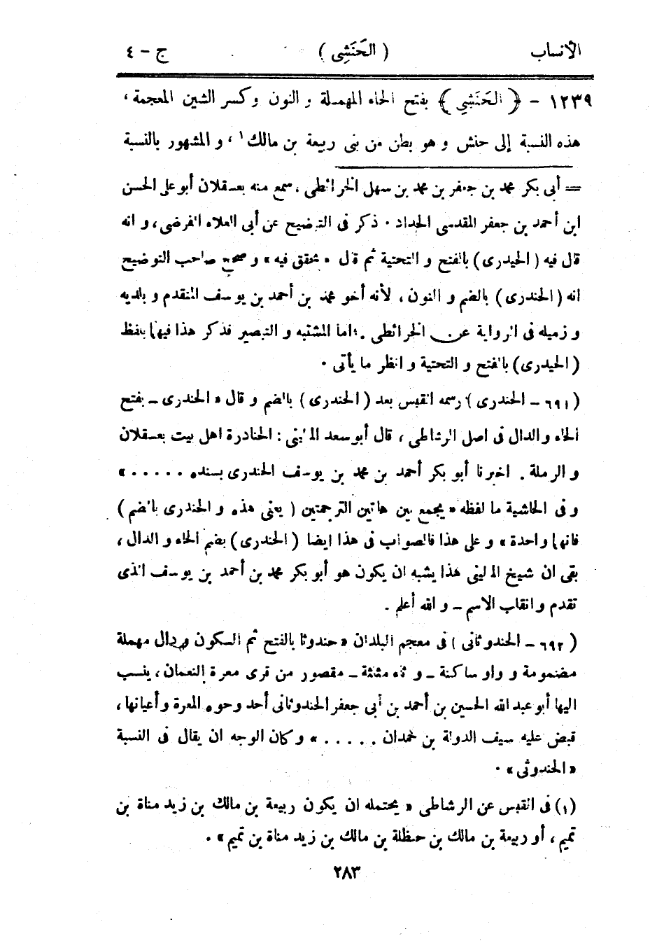 (692- الحندوثانى) في معجم البلدان «حندوثا بالفتح ثم السكون ودال مهملة مضمومة وواو ساكنة- وثاء مثلثة- مقصور من قرى معرة النعمان، ينسب اليها أبو عبد الله الحسين بن أحمد بن أبى جعفر الحندوثانى أحد وجوه المعرة وأعيانها، قبض عليه سيف الدولة بن حمدان.....» وكان الوجه ان يقال في النسبة «الحندوثى» .
