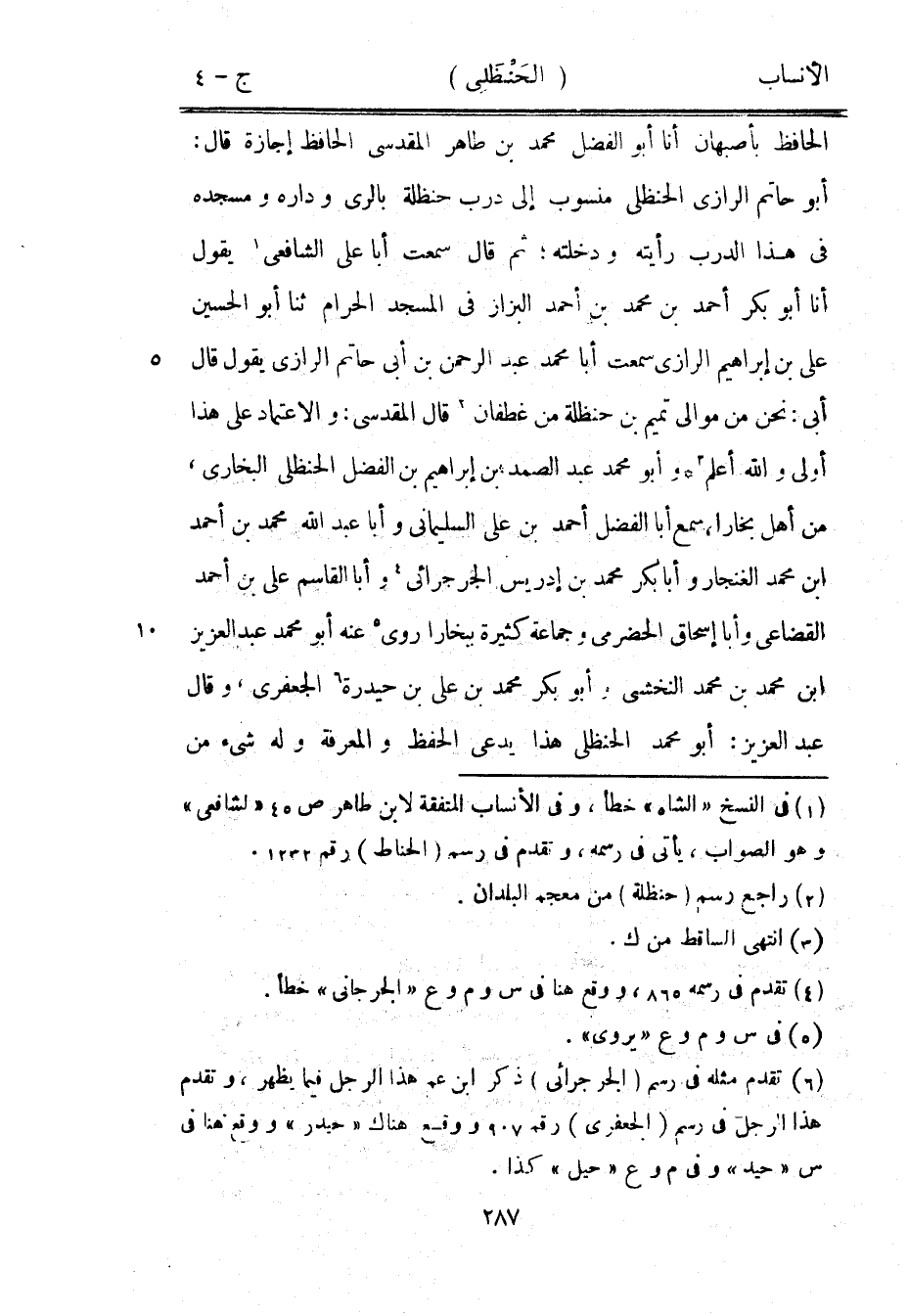 أبو حاتم الرازيّ الحنظليّ منسوب إلى درب حنظلة بالري وداره ومسجده في هذا الدرب رأيته ودخلته، ثم قال سمعت أبا على الشافعيّ [1] يقول أنا أبو بكر أحمد بن محمد بن أحمد البزاز في المسجد الحرام ثنا أبو الحسين على بن إبراهيم الرازيّ سمعت أبا محمد عبد الرحمن بن أبى حاتم الرازيّ يقول قال أبى: نحن من موالي تميم بن حنظلة من غطفان [2] قال المقدسي: والاعتماد على هذا أولى والله أعلم [3] وأبو محمد عبد الصمد بن إبراهيم بن الفضل الحنظليّ البخاري، من أهل بخارا، سمع أبا الفضل أحمد بن على السليماني وأبا عبد الله محمد بن أحمد ابن محمد الغنجار وأبا بكر محمد بن إدريس الجرجرائى [4] وأبا القاسم على بن أحمد القضاعي وأبا إسحاق الحضرميّ وجماعة كثيرة ببخارا روى [5] عنه أبو محمد عبد العزيز ابن محمد بن محمد النخشى وأبو بكر محمد بن على بن حيدرة [6] الجعفري، وقال عبد العزيز: أبو محمد الحنظليّ هذا يدعى الحفظ والمعرفة وله شيء من