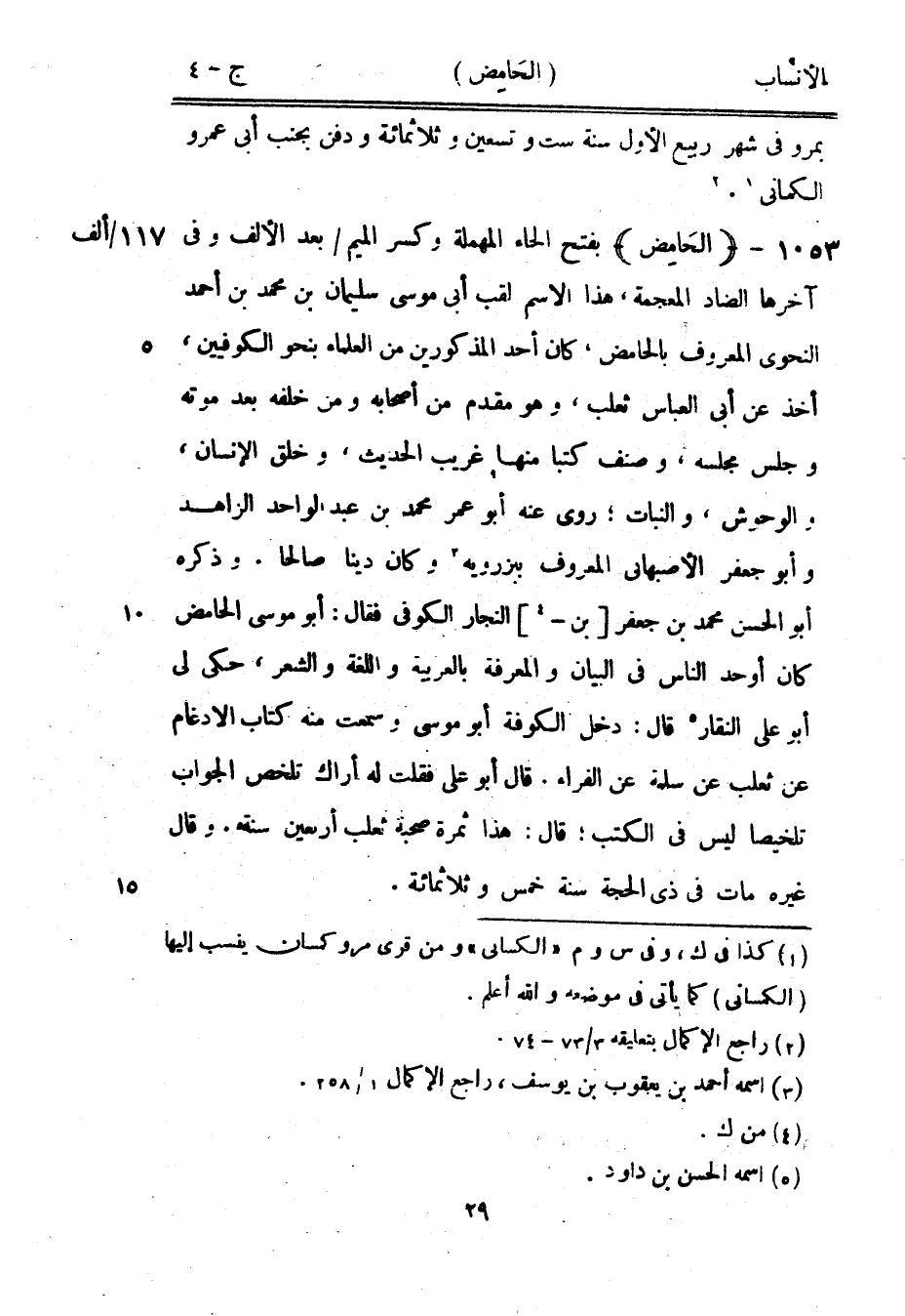 بفتح الحاء المهملة وكسر الميم/ بعد الألف وفي 117/ ألف آخرها الضاد المعجمة، هذا الاسم لقب أبى موسى سليمان بن محمد بن أحمد النحويّ المعروف بالحامض، كان أحد المذكورين من العلماء بنحو الكوفيين، أخذ عن أبى العباس ثعلب، وهو مقدم من أصحابه ومن خلفه بعد موته وجلس مجلسه، وصنف كتبا منها غريب الحديث، وخلق الإنسان، والوحوش، والنبات، روى عنه أبو عمر محمد بن عبد الواحد الزاهد وأبو جعفر الأصبهاني المعروف ببزرويه [3] وكان دينا صالحا. وذكره أبو الحسن محمد بن جعفر [بن-[4]] النجار الكوفي فقال: أبو موسى الحامض كان أوحد الناس في البيان والمعرفة بالعربية واللغة والشعر، حكى لي أبو على النقار [5] قال: دخل الكوفة أبو موسى وسمعت منه كتاب الإدغام عن ثعلب عن سلمة عن الفراء. قال أبو على فقلت له أراك تلخص الجواب تلخيصا ليس في الكتب، قال: هذا ثمرة صحبة ثعلب أربعين سنة. وقال غيره مات في ذي الحجة سنة خمس وثلاثمائة.