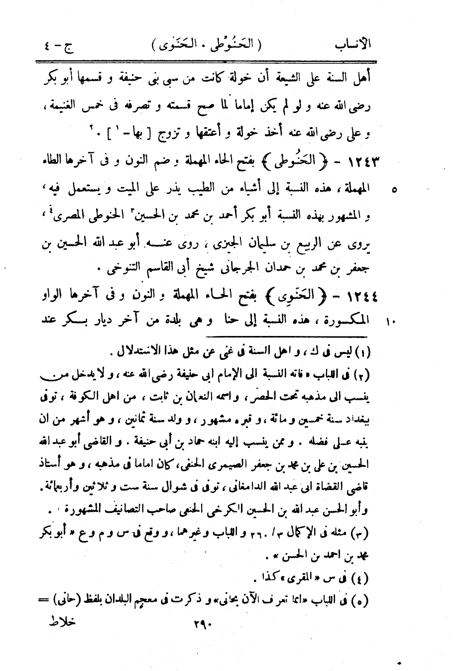 بفتح الحاء المهملة وضم النون وفي آخرها الطاء المهملة، هذه النسبة إلى أشياء من الطيب يذر على الميت ويستعمل فيه، والمشهور بهذه النسبة أبو بكر أحمد بن محمد بن الحسين [3] الحنوطي المصري [4] ، يروى عن الربيع بن سليمان الجيزى، روى عنه أبو عبد الله الحسين بن جعفر بن محمد بن حمدان الجرجاني شيخ أبى القاسم التنوخي.
