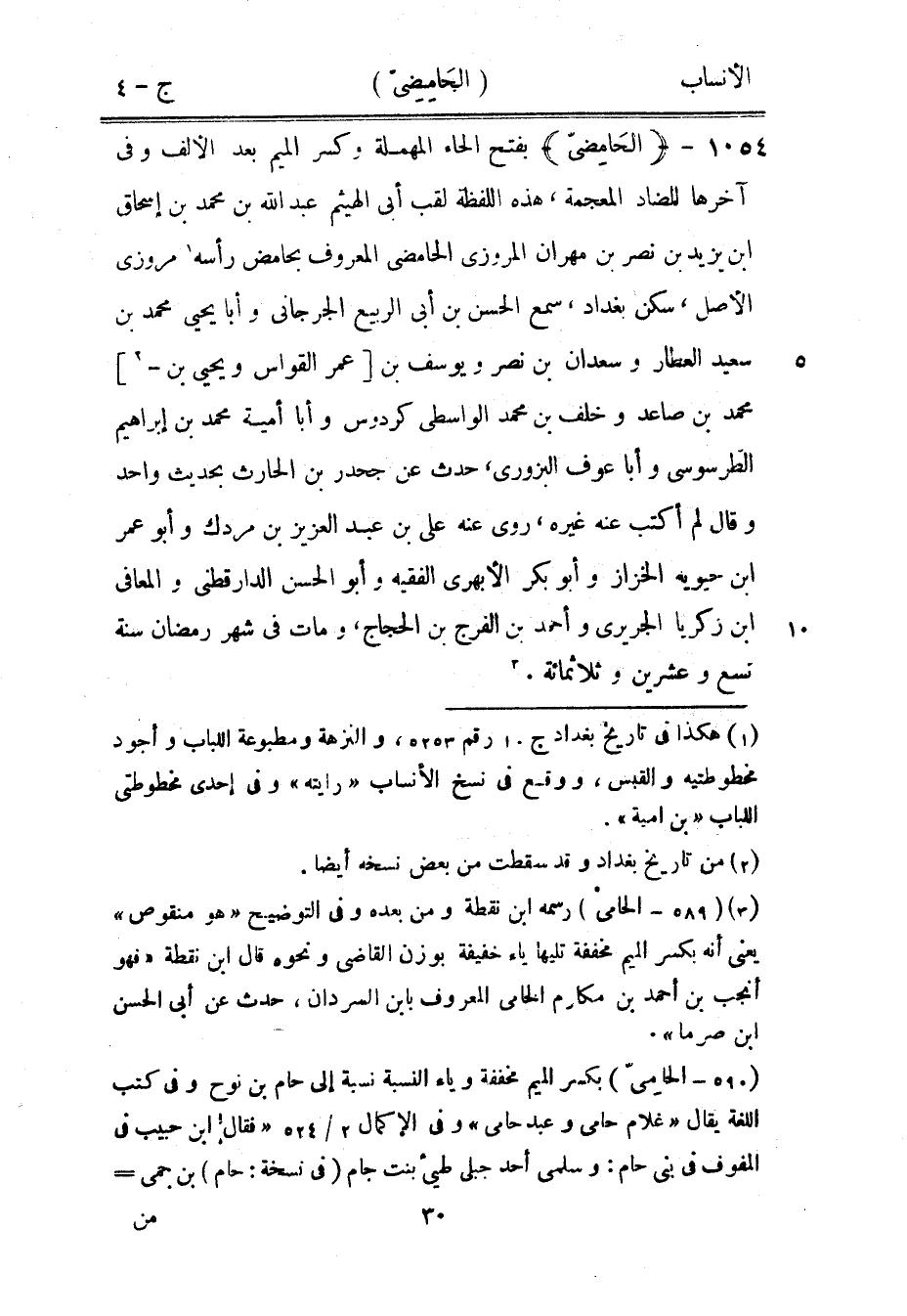 (590- الحامىّ) بكسر الميم مخففة وياء النسبة نسبة إلى حام بن نوح وفي كتب اللغة يقال «غلام حامي وعبد حامي» وفي الإكمال 2/ 524 «فقال ابن حبيب في المفوف في بنى حام: وسلمى أحد جبلي طيِّئ بنت جام (في نسخة: حام) بن جمى
