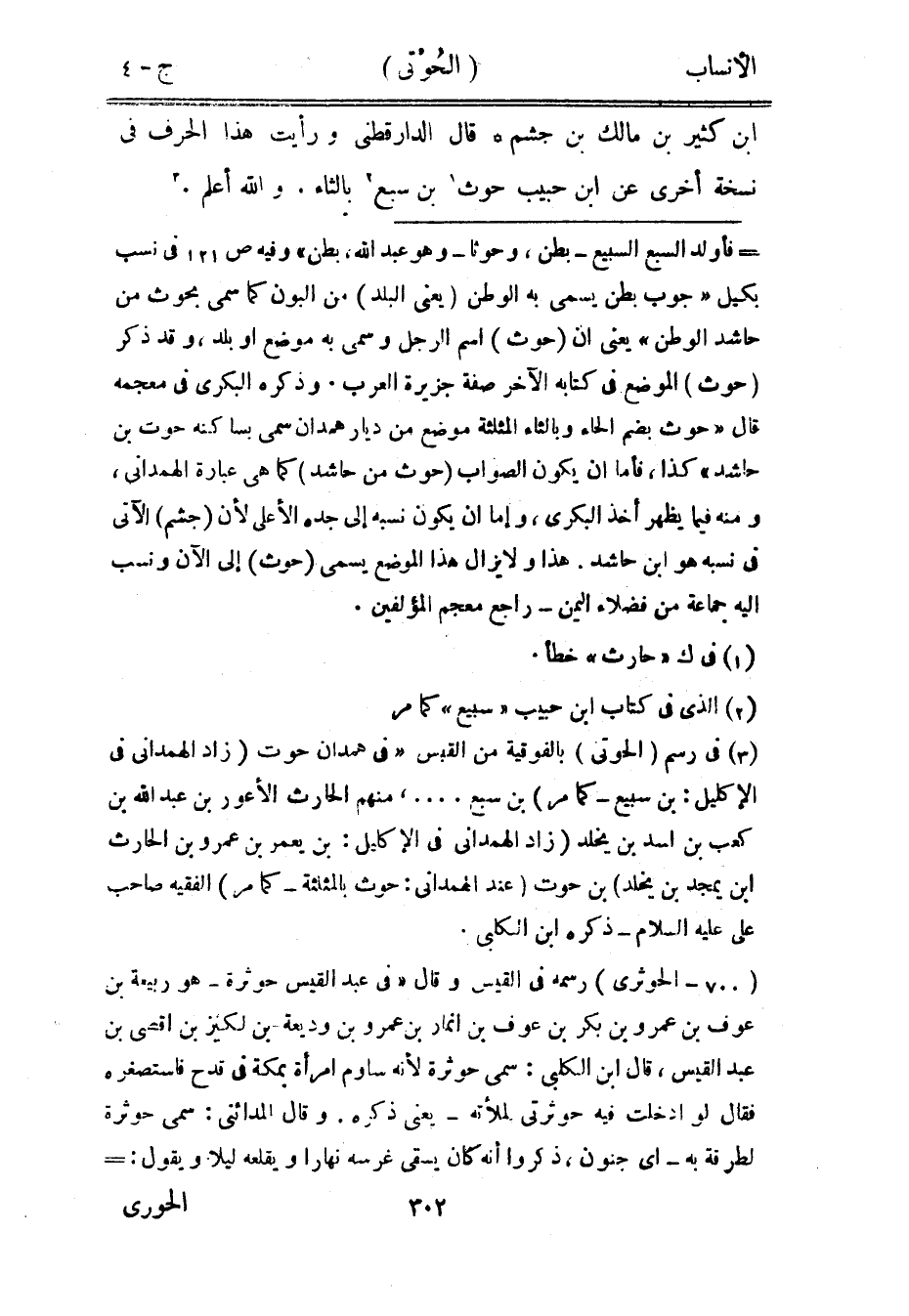 [3] في رسم (الحوتى) بالفوقية من القبس «في همدان حوت (زاد الهمدانيّ في الإكليل: بن سبيع- كما مر) بن سبع....، منهم الحارث الأعور بن عبد الله بن كعب بن أسد بن يخلد (زاد الهمدانيّ في الإكليل: بن يعمر بن عمرو بن الحارث ابن يمجد بن يخلد) بن حوت (عند الهمدانيّ: حوث بالمثلثة- كما مر) الفقيه صاحب على عليه السلام- ذكره ابن الكلبي.