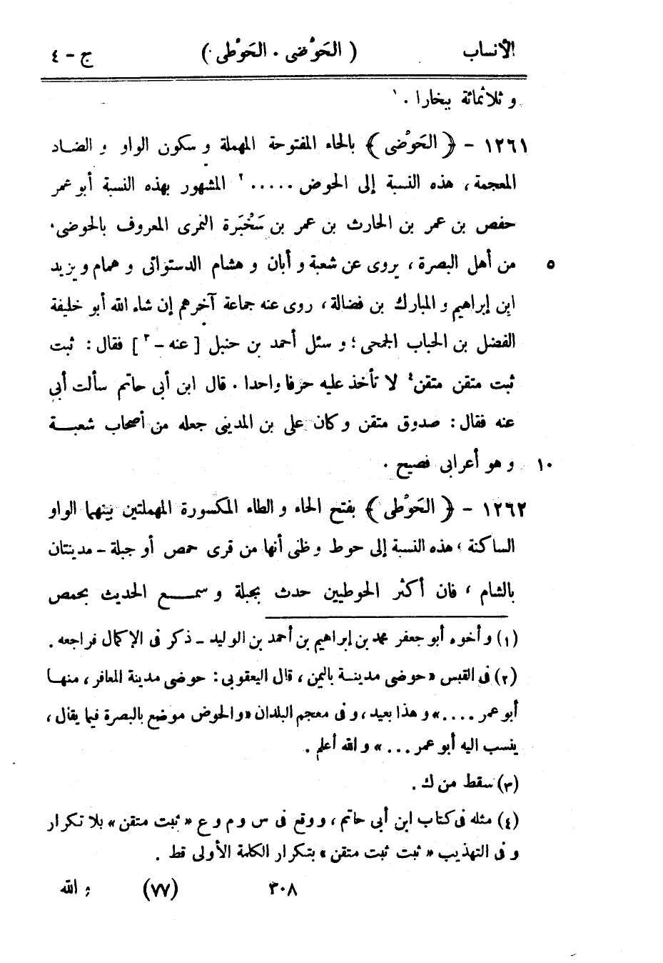 [2] في القبس «حوضي مدينة باليمن، قال اليعقوبي: حوضي مدينة المعافر، منها أبو عمر....» وهذا بعيد، وفي معجم البلدان «والحوض موضع بالبصرة فيما يقال، ينسب اليه أبو عمر ... » والله أعلم.