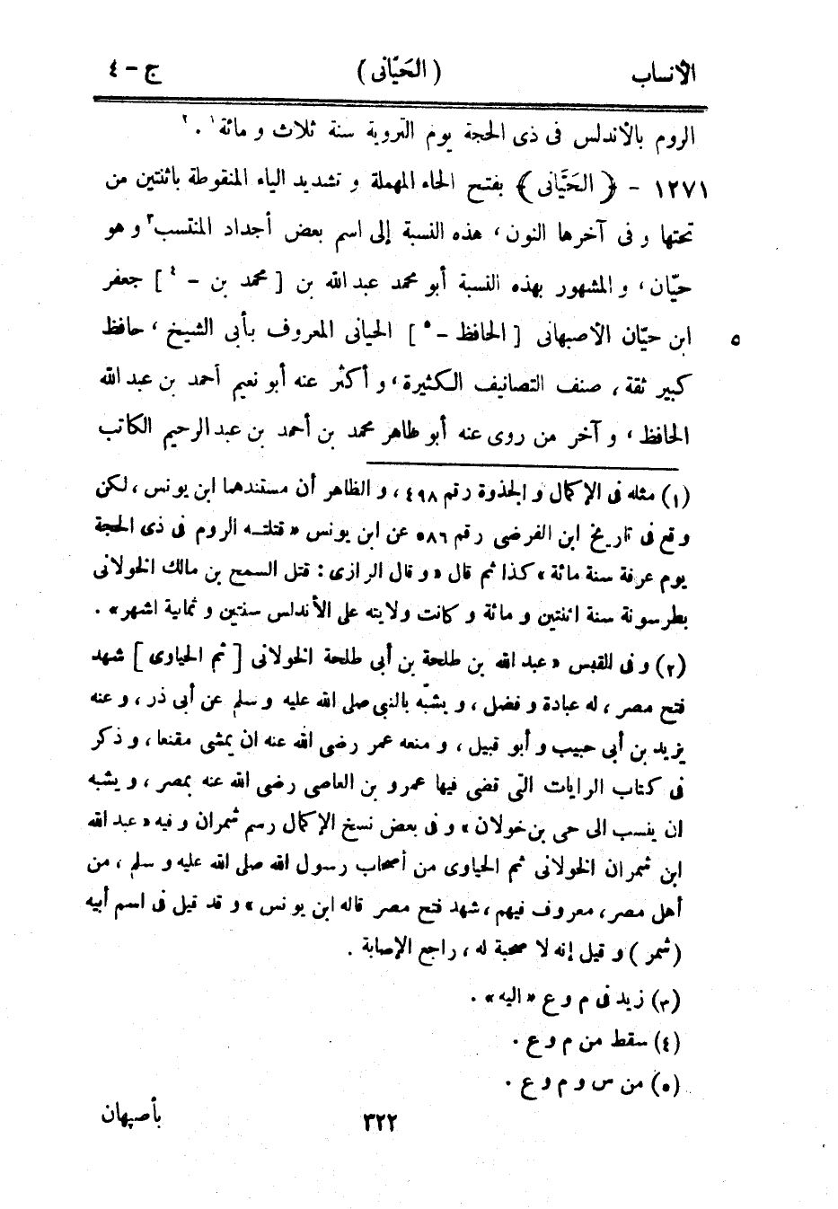 بفتح الحاء المهملة وتشديد الياء المنقوطة باثنتين من تحتها وفي آخرها النون، هذه النسبة إلى اسم بعض أجداد المنتسب [3] وهو حيّان، والمشهور بهذه النسبة أبو محمد عبد الله بن [محمد بن-[4]] جعفر ابن حيّان الأصبهاني [الحافظ-[5]] الحيانى المعروف بأبي الشيخ، حافظ كبير ثقة، صنف التصانيف الكثيرة، وأكثر عنه أبو نعيم أحمد بن عبد الله الحافظ، وآخر من روى عنه أبو طاهر محمد بن أحمد بن عبد الرحيم الكاتب
