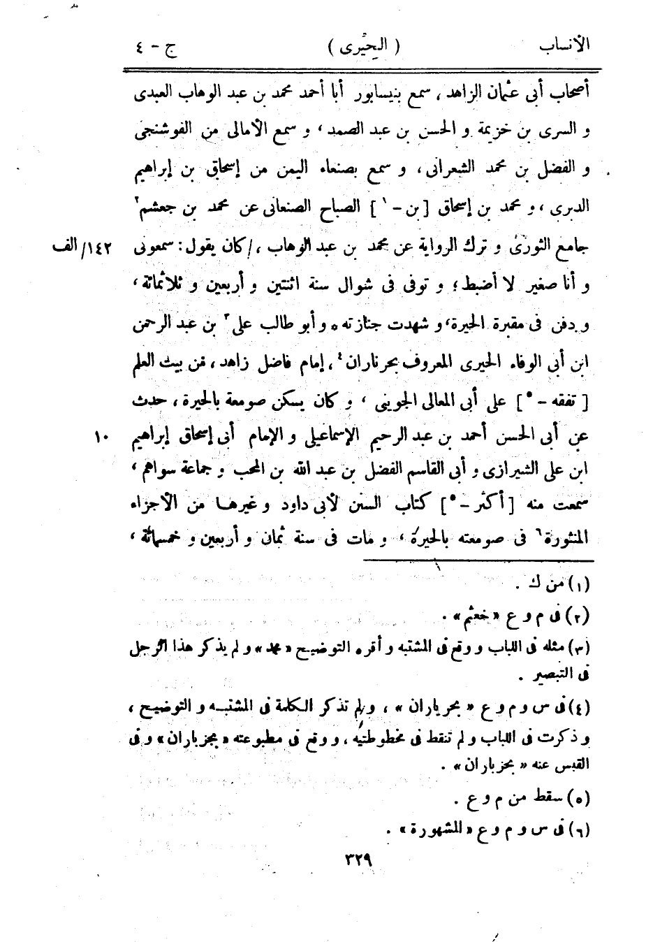 أصحاب أبى عثمان الزاهد، سمع بنيسابور أبا أحمد محمد بن عبد الوهاب العبديّ والسري بن خزيمة والحسن بن عبد الصمد، وسمع الأمالي من الفوشنجى والفضل بن محمد الشعراني، وسمع بصنعاء اليمن من إسحاق بن إبراهيم الدبرى، ومحمد بن إسحاق [بن-[1]] الصباح الصنعاني عن محمد بن جعشم [2] جامع الثوري وترك الرواية عن محمد بن عبد الوهاب،/ كان يقول: سمعوني وأنا صغير لا أضبط، وتوفى في شوال سنة اثنتين وأربعين وثلاثمائة، ودفن في مقبرة الحيرة، وشهدت جنازته وأبو طالب على [3] بن عبد الرحمن ابن أبى الوفاء الحيريّ المعروف بحرناران [4] ، إمام فاضل زاهد، من بيت العلم [تفقه-[5]] على أبى المعالي الجويني، وكان يسكن صومعة بالحيرة، حدث عن أبى الحسن أحمد بن عبد الرحيم الإسماعيلي والإمام أبى إسحاق إبراهيم ابن على الشيرازي وأبى القاسم الفضل بن عبد الله بن المحب وجماعة سواهم، سمعت منه [أكثر-[5]] كتاب السنن لأبى داود وغيرها من الأجزاء المنثورة [6] في صومعته بالحيرة، ومات في سنة ثمان وأربعين وخمسمائة،