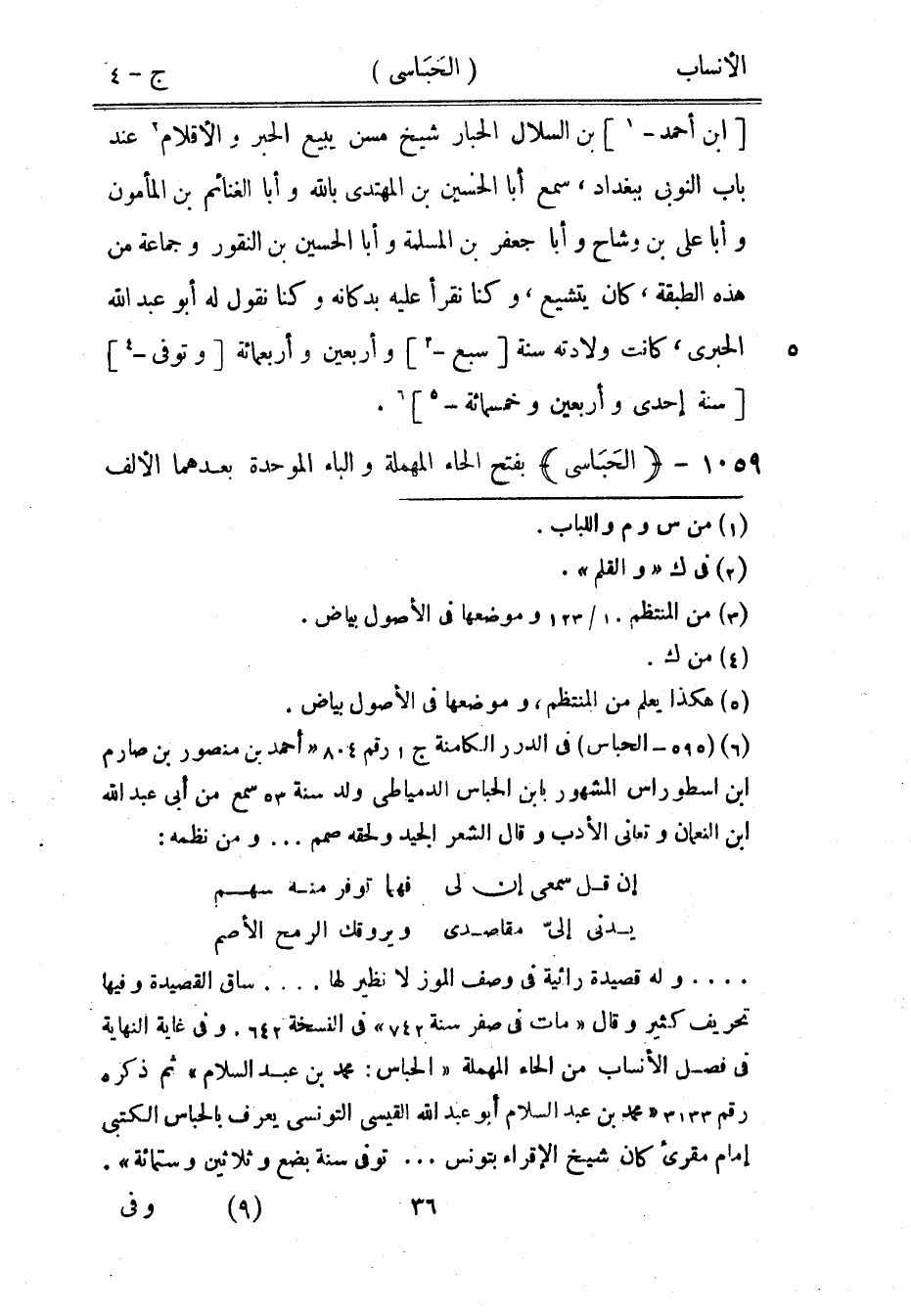 .... وله قصيدة رائية في وصف الموز لا نظير لها ... ساق القصيدة وفيها تحريف كثير وقال «مات في صفر سنة 742» في النسخة 642. وفي غاية النهاية في فصل الأنساب من الحاء المهملة «الحباس: محمد بن عبد السلام» ثم ذكره رقم 3133 «محمد بن عبد السلام أبو عبد الله القيسي التونسي يعرف بالحباس الكتبي إمام مقرئ كان شيخ الإقراء بتونس ... توفى سنة بضع وثلاثين وستمائة» .