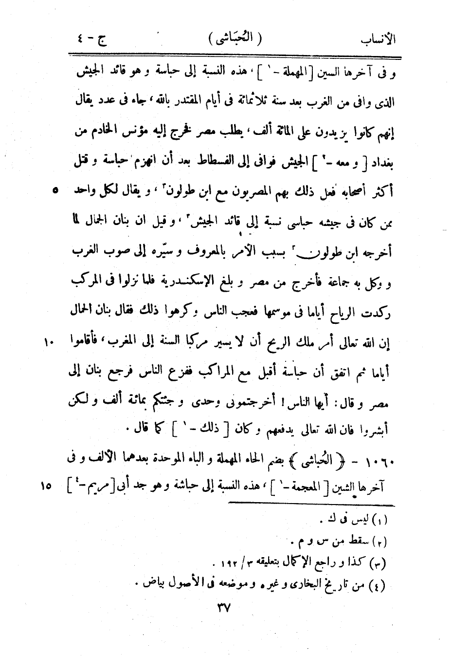 وفي آخرها السين [المهملة-[1]] ، هذه النسبة إلى حباسة وهو قائد الجيش الّذي وافى من الغرب بعد سنة ثلاثمائة في أيام المقتدر باللَّه، جاء في عدد يقال إنهم كانوا يزيدون على المائة ألف، يطلب مصر فخرج إليه مؤنس الخادم من بغداد [ومعه-[2]] الجيش فوافى إلى الفسطاط بعد أن انهزم حباسة وقتل أكثر أصحابه فعل ذلك بهم المصريون مع ابن طولون [3] ، ويقال لكل واحد ممن كان في جيشه حباسى نسبة إلى قائد الجيش [3] ، وقيل ان بنان الجمال لما أخرجه ابن طولون [3] بسبب الأمر بالمعروف وسيّره إلى صوب الغرب ووكل به جماعة فأخرج من مصر وبلغ الإسكندرية فلما نزلوا في المركب ركدت الرياح أياما في موسمها فعجب الناس وكرهوا ذلك فقال بنان الحمال إن الله تعالى أمر ملك الريح أن لا يسير مركبا السنة إلى المغرب، فأقاموا أياما ثم اتفق أن حباسة أقبل مع المراكب ففزع الناس فرجع بنان إلى مصر وقال: أيها الناس! أخرجتمونى وحدي وجئتكم بمائة ألف ولكن أبشروا فان الله تعالى يدفعهم وكان [ذلك-[1]] كما قال.
