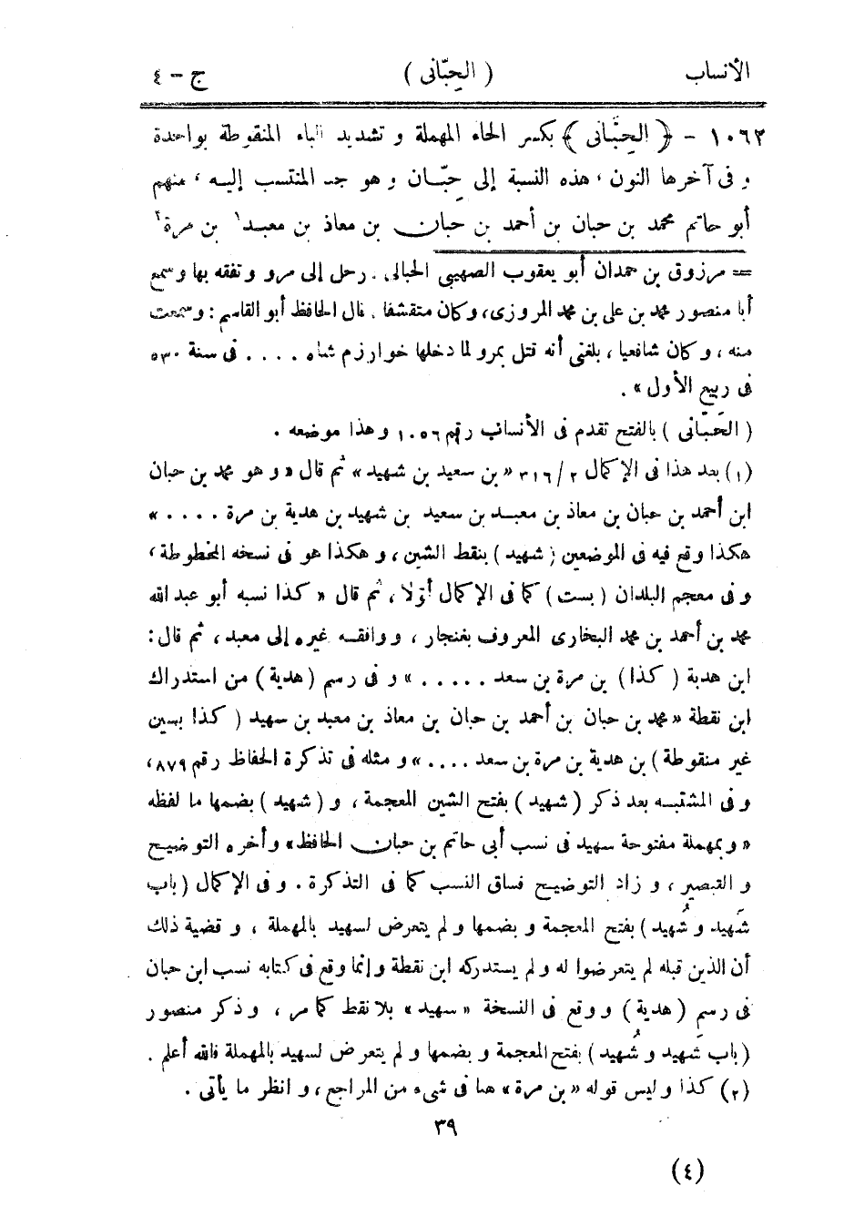 ابن هدبة (كذا) بن مرة بن سعد....» وفي رسم (هدية) من استدراك ابن نقطة «محمد بن حبان بن أحمد بن حبان بن معاذ بن معبد بن سهيد (كذا بسين غير منقوطة) بن هدية بن مرة بن سعد ... » ومثله في تذكرة الحفاظ رقم 879، وفي المشتبه بعد ذكر (شهيد) بفتح الشين المعجمة، و (شهيد) بضمها ما لفظه «وبمهملة مفتوحة شهيد في نسب أبى حاتم بن حبان الحافظ» وأخره التوضيح والتبصير، وزاد التوضيح فساق النسب كما في التذكرة. وفي الإكمال (باب شهيد وشهيد) بفتح المعجمة وبضمها ولم يتعرض لسهيد بالمهملة، وقضية ذلك أن الذين قبله لم يتعرضوا له ولم يستدركه ابن نقطة وإنما وقع في كتابه نسب ابن حبان في رسم (هدية) ووقع في النسخة «سهيد» بلا نقط كما مر، وذكر منصور (باب شهيد وشهيد) بفتح المعجمة وبضمها ولم يتعرض لسهيد بالمهملة فاللَّه أعلم.