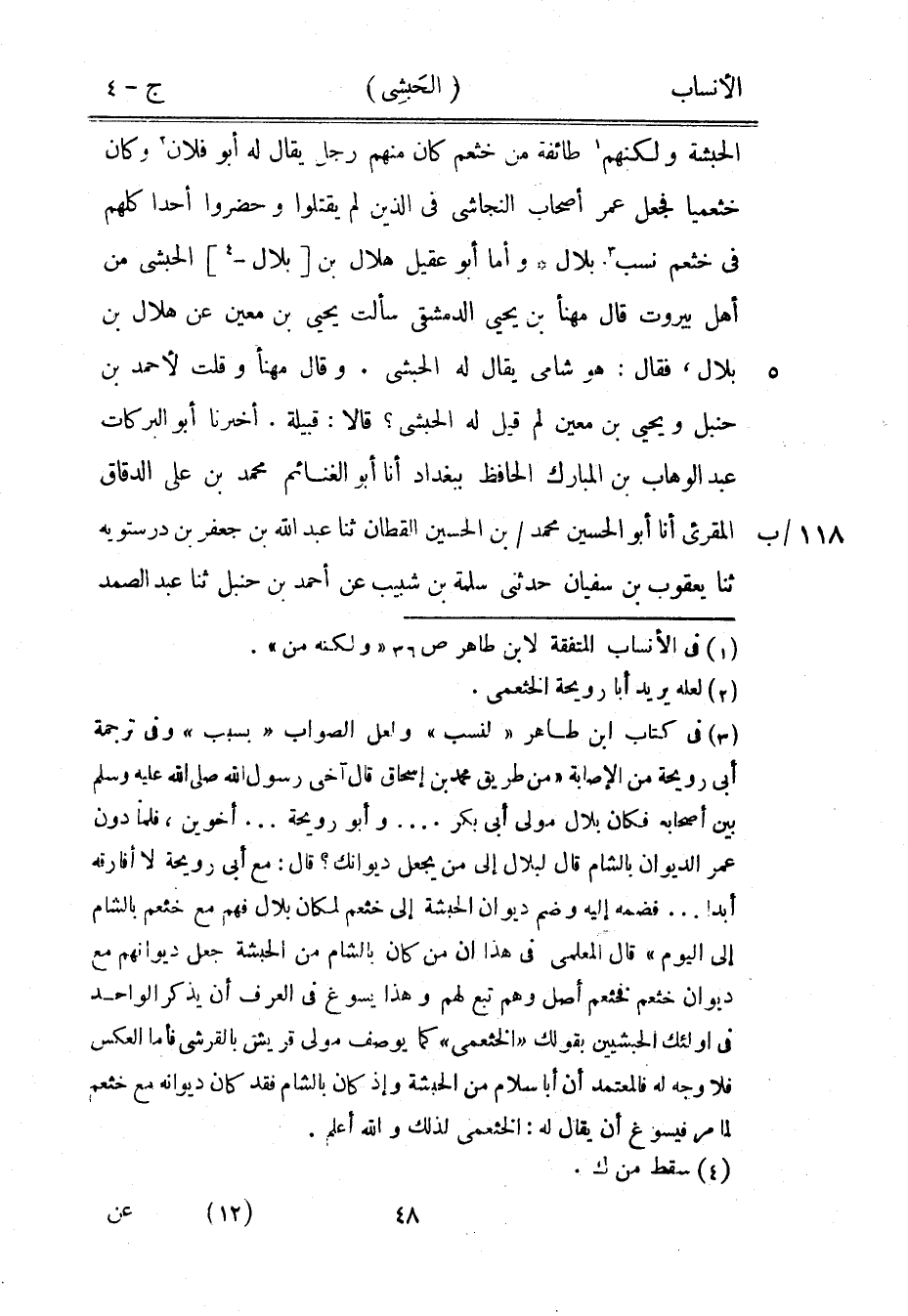 [3] في كتاب ابن طاهر «لنسب» ولعل الصواب «بسبب» وفي ترجمة أبى رويحة من الإصابة «من طريق محمد بن إسحاق قال آخى رسول الله صلى الله عليه وسلم بين أصحابه فكان بلال مولى أبى بكر ... وأبو رويحة ... أخوين، فلما دون عمر الديوان بالشام قال لبلال إلى من يجعل ديوانك؟ قال: مع أبى رويحة لا أفارقه أبدا ... فضمه إليه وضم ديوان الحبشة إلى خثعم لمكان بلال فهم مع خثعم بالشام إلى اليوم» قال المعلمي في هذا ان من كان بالشام من الحبشة جعل ديوانهم مع ديوان خثعم فخثعم أصل وهم تبع لهم وهذا يسوغ في العرف أن يذكر الواحد في أولئك الحبشيين بقولك «الخثعميّ» كما يوصف مولى قريش بالقرشي فأما العكس فلا وجه له فالمعتمد أن أبا سلام من الحبشة وإذا كان بالشام فقد كان ديوانه مع خثعم لما مر فيسوغ أن يقال له: الخثعميّ لذلك والله أعلم.