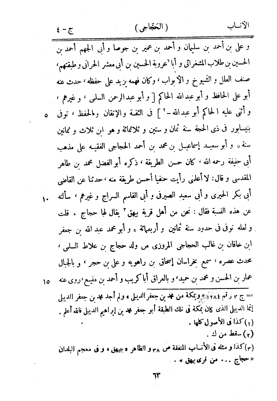 وعلى بن أحمد بن سليمان وأحمد بن عمير بن جوصا وأبى الجهم أحمد بن الحسين بن طلاب المشغرائي وأبا [1] عروبة الحسين بن أبى معشر الحراني وطبقتهم، صنف العلل والشيوخ والأبواب، وكان فهمه يزيد على حفظه، حدث عنه أبو على الحافظ وأبو عبد الله الحاكم [وأبو عبد الرحمن السلمي، وغيرهم، وأثنى عليه الحاكم أبو عبد الله-[2]] في الثقة والإتقان والحفظ، توفى بنيسابور في ذي الحجة سنة ثمان وستين وثلاثمائة وهو ابن ثلاث وثمانين سنة وأبو سعيد إسماعيل بن محمد بن أحمد الحجاجى الفقيه على مذهب أبى حنيفة رحمه الله، كان حسن الطريقة، ذكره أبو الفضل محمد بن طاهر المقدسي وقال: لا أعلمنى رأيت حنفيا أحسن طريقة منه، حدثنا عن القاضي أبى بكر الحيريّ وأبى سعيد الصيرفي وأبى القاسم السراج وغيرهم، سألته عن هذه النسبة فقال: نحن من أهل قرية بيهق [3] يقال لها حجاج. قلت ولعله توفى في حدود سنة ثمانين وأربعمائة وأبو محمد عبد الله بن جعفر ابن خاقان بن غالب الحجاجى المروزي من ولد حجاج بن علاط السلمي، محدث عصره، سمع بخراسان إسحاق بن راهويه وعلى بن حجر، وبالجبال عمار بن الحسن ومحمد بن حميد، وبالعراق أبا كريب وأحمد بن منيع، روى عنه