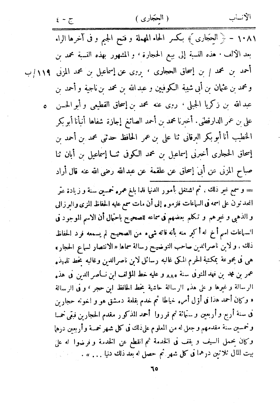 [ () ] وسمع غير ذلك، ثم اشتغل بأمور الدنيا فلما بلغ عمره خمسين سنة وزيادة عثر المحدثون على اسمه في السماعات فلزموه إلى أن مات سمع عليه الحفاظ المزي والبرزالي والذهبي وغيرهم وتكلم بعضهم في سماعه للصحيح باحتمال أن الاسم الموجود في السماعات اسم أخ له أكبر منه بأنه فاته شيء من الصحيح لم يسمعه فرد الحفاظ ذلك، ولابن ناصر الدين صاحب التوضيح رسالة سماها «الانتصار لسماع الحجار» هي في مجموعة بمكتبة الحرم المكيّ غالبة رسائل لابن ناصر الدين وغالبة بخط تلميذه عمر بن محمد بن فهد المتوفى سنة 885 وعليه خط المؤلف ابن ناصر الدين في هذه الرسالة وغيرها وعلى هذه الرسالة حاشيد بخط الحافظ ابن حجر، وفي الرسالة «وكان أحمد هذا في أوّل أمره خياطا ثم خدم بقلعة دمشق هو واخوته حجارين في سنة أربع وأربعين وستمائة ثم قرروا أحمد المذكور مقدم الحجارين فبقي خمسا وخمسين سنة مقدمهم وجعل له من المعلوم على ذلك في كل شهر خمسة وأربعين درهما وكان يحمل السيف ويقف في الخدمة ثم انقطع عن الخدمة وفرضوا له على بيت المال ثلاثين درهما في كل شهر ثم حصل له بعد ذلك دنيا ... » .