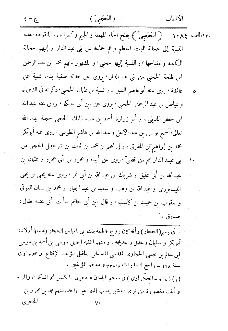 بفتح الحاء المهملة والجيم وكسر الباء/ المنقوطة، هذه النسبة إلى حجابة البيت المعظم وهم جماعة من بنى عبد الدار وإليهم حجابة الكعبة ومفتاحها، والنسبة إليها حجى، والمشهور منهم محمد بن عبد الرحمن ابن طلحة الحجبي من بنى عبد الدار، يروى عن جدته صفية بنت شيبة عن عائشة، روى عنه أبو عاصم النبيل وشيبة بن عثمان الحجبي، ذكرته في الشين وعياض بن عبد الرحمن الحجبي، يروى عن ابن أبى مليكة، روى عنه عبد الله ابن جعفر المديني وأبو زرارة أحمد بن عبد الملك الحجبي حجبة بيت الله تعالى، سمع يونس بن عبد الأعلى وعبد الله بن هاشم الطوسي، روى عنه أبو بكر محمد بن إبراهيم بن المقرئ وإبراهيم بن محمد بن ثابت بن شرحبيل الحجبي من بنى عبد الدار ثم من قصىّ، روى عن أبيه وعمرو بن أبى عمرو وعثمان بن عبد الله بن أبى عتيق وشريك بن عبد الله بن أبى نمر، روى عنه يحيى بن يحيى النيسابورىّ وعبد الله بن وهب وسعيد بن عبد الجبار ومحمد بن سنان العوقى ويعقوب بن حميد بن كاسب، وقال ابن أبى حاتم سألت أبى عنه فقال: