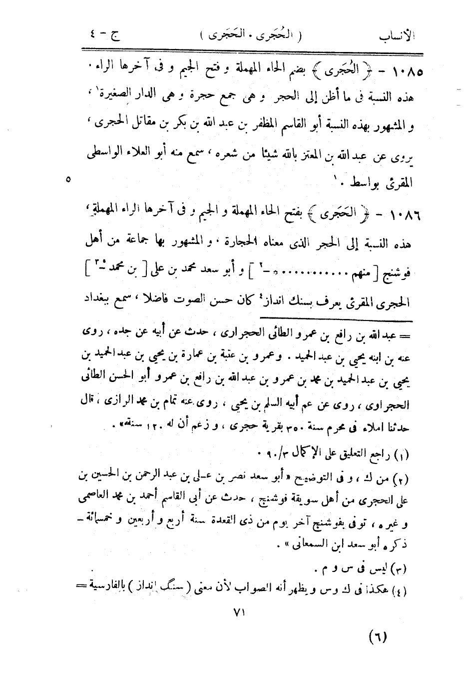 بفتح الحاء المهملة والجيم وفي آخرها الراء المهملة، هذه النسبة إلى الحجر الّذي معناه الحجارة، والمشهور بها جماعة من أهل فوشنج [منهم......-[2]] وأبو سعد محمد بن على [بن محمد-[3]] الحجري المقرئ يعرف بسنك انداز [4] كان حسن الصوت فاضلا، سمع ببغداد