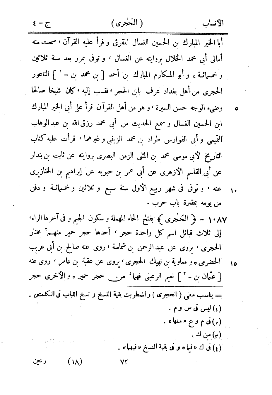 بفتح الحاء المهملة وسكون الجيم وفي آخرها الراء، إلى ثلاث قبائل اسم كل واحدة حجر، أحدها حجر حمير منهم [2] مختار الحجري، يروى عن عبد الرحمن بن شماسة، روى عنه صالح بن أبى عريب الحضرميّ ومعاوية بن نهيك الحجري، يروى عن عقبة بن عامر، روى عنه [عثمان بن-[3] نعيم الرعينيّ فهما [4] من حجر حمير والأخرى حجر